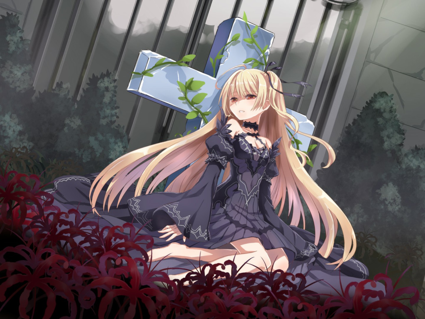 Description: A woman sitting in a field of flowers with a cross in the background and a cross in the foreground.