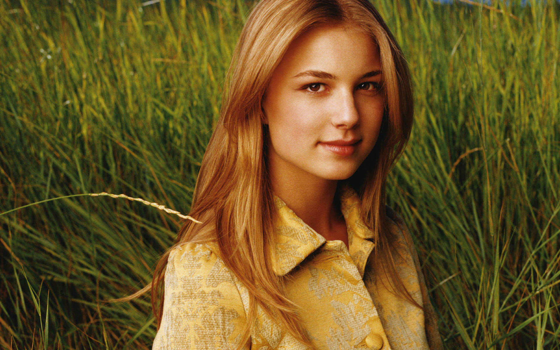 Description: A woman standing in a field of tall grass with a yellow shirt on and a blue and white umbrella.