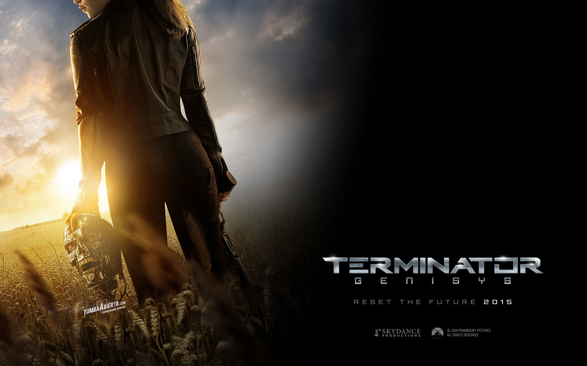Description: A woman standing in a field with a gun in her hand and the words terminator on it in front of a sunset.