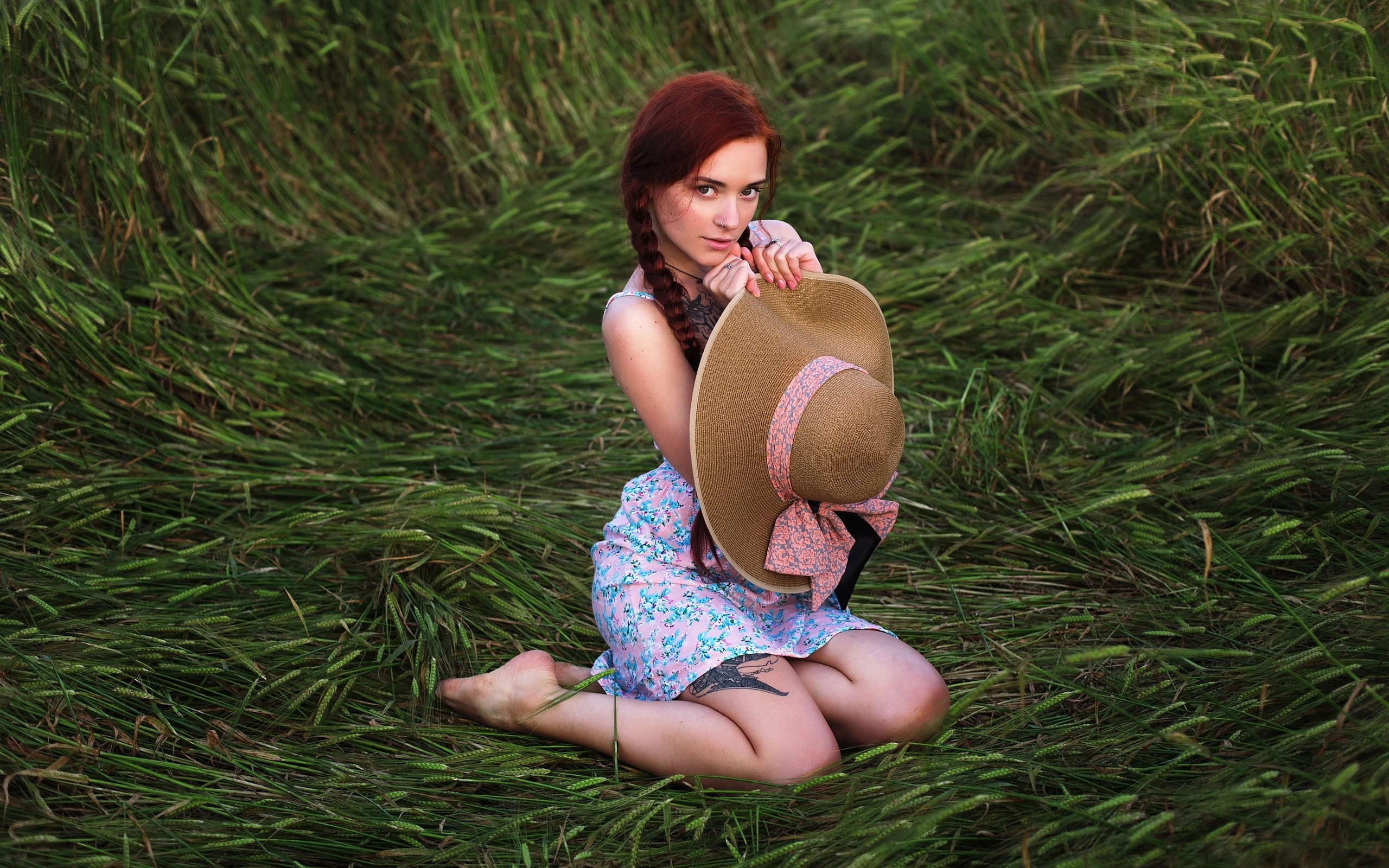 Description: A woman sitting in a field of grass with a hat on her head and a pink bow around her neck.
