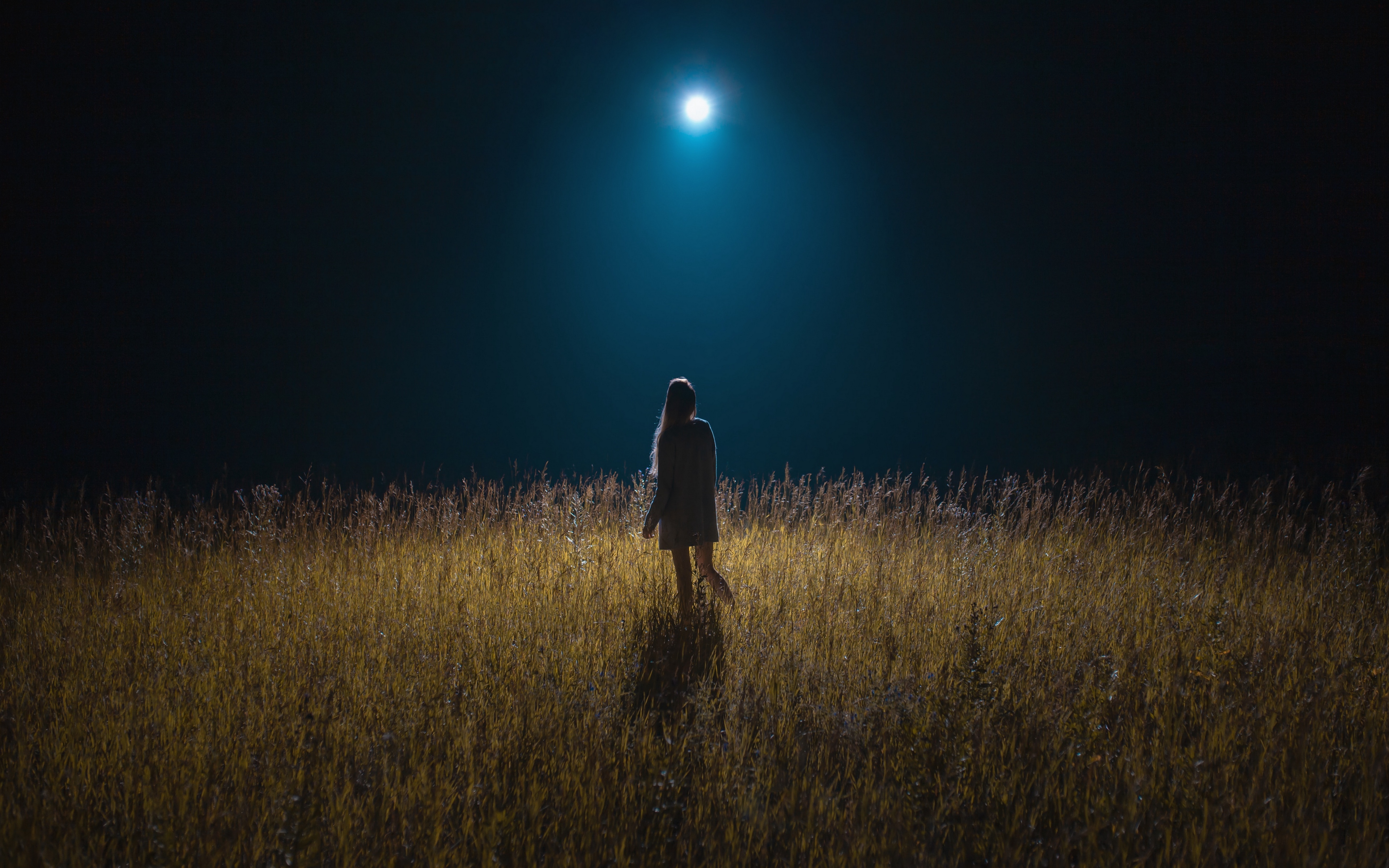 Description: A woman standing in a field at night under a bright light in the sky above her head is a full moon.