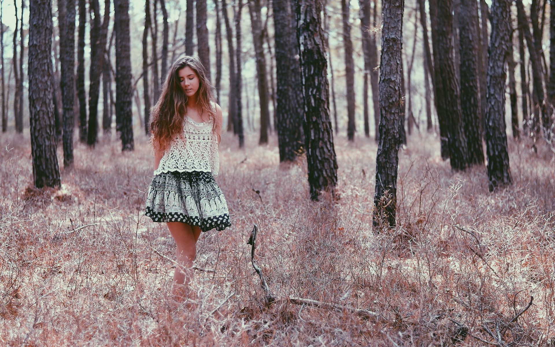 Description: A woman standing in a field of tall grass near trees and bushes with a frilly skirt on her.