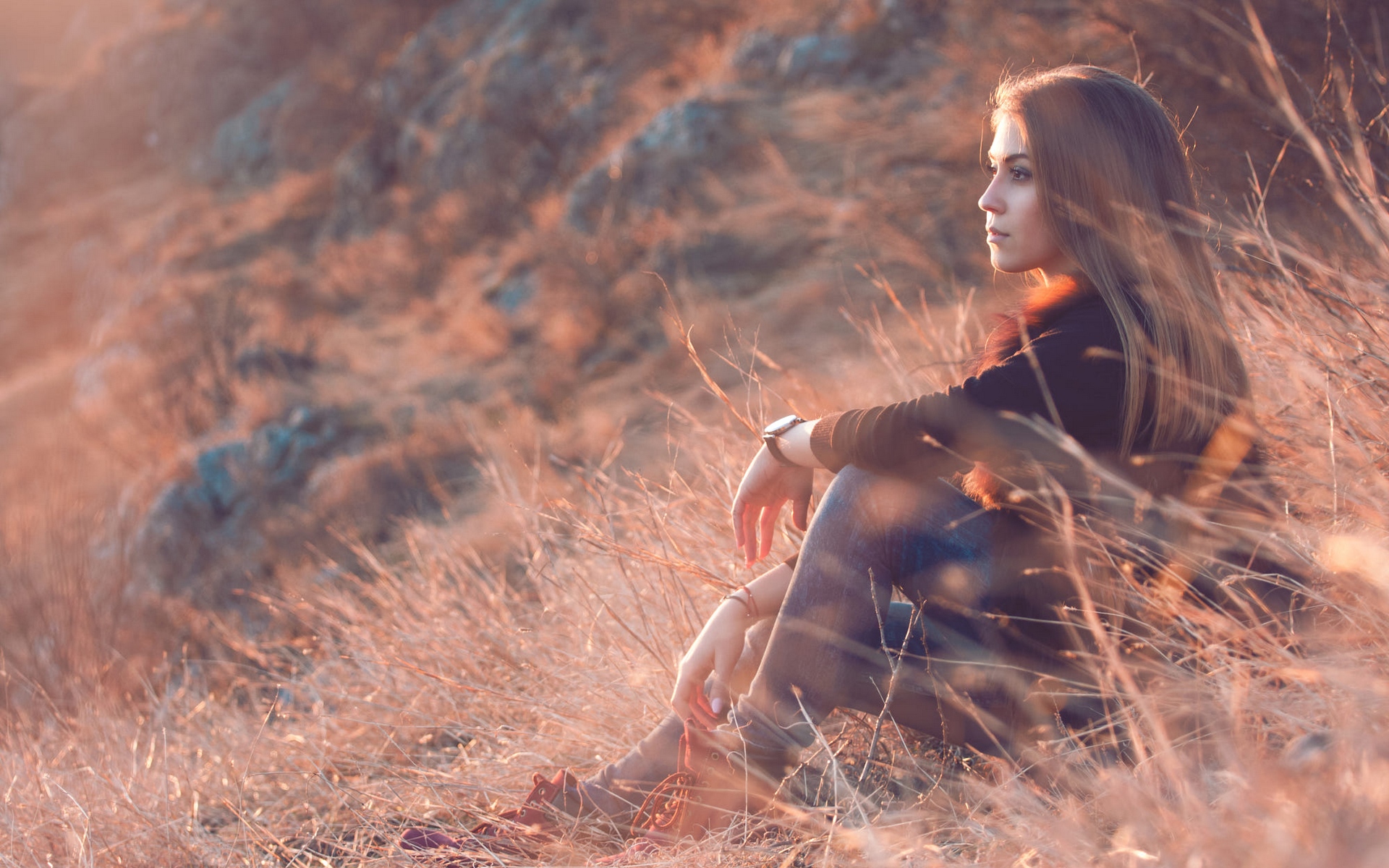 Description: A woman sitting in a field of tall grass looking off into the distance with her eyes closed and her hair in the wind.