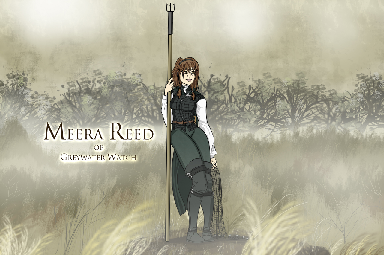 Description: A woman holding a pole in a field of grass with trees in the background and a sky background with clouds.