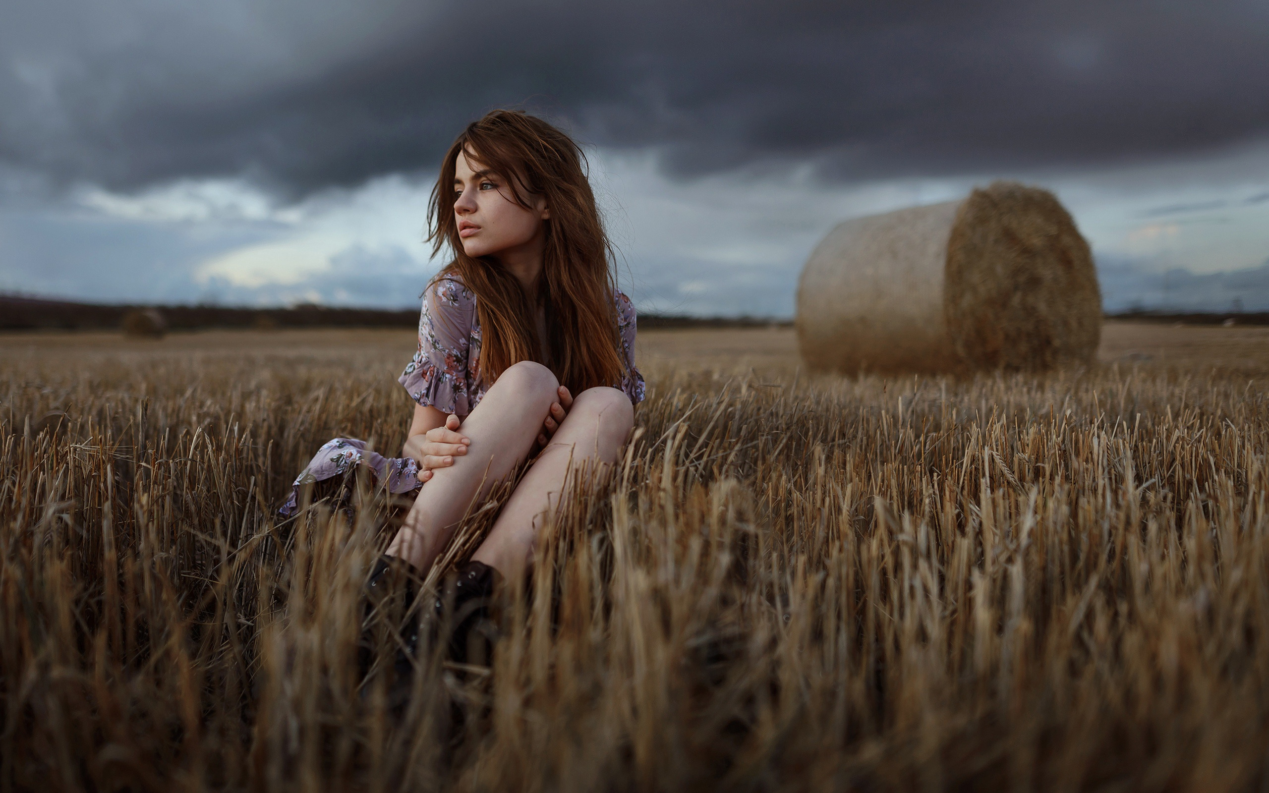Description: A woman sitting in a field of wheat with a bale of hay in the background and a cloudy sky.