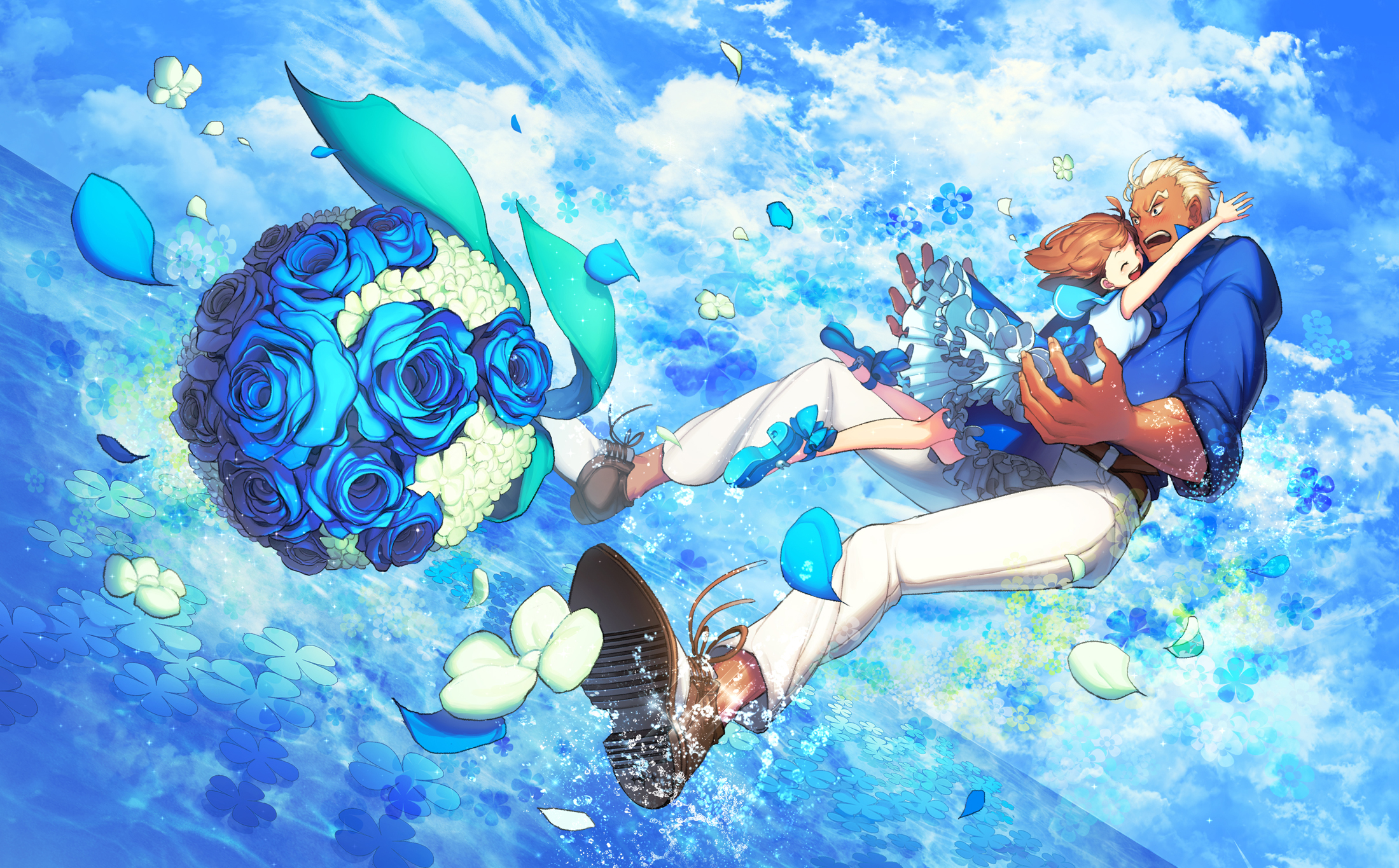 Description: A woman is floating in the air with a bouquet of flowers and a man is holding a glass of wine.