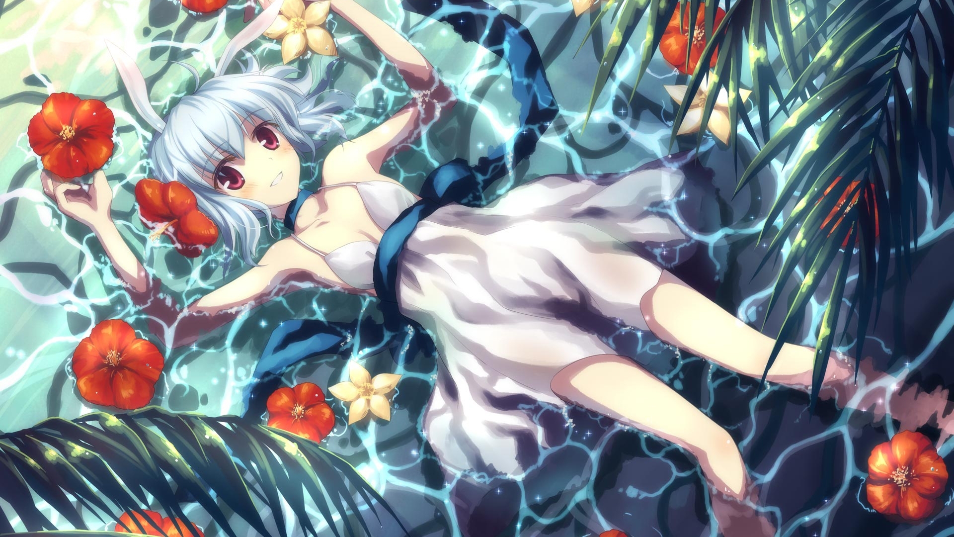 Description: A woman floating in a pool of water surrounded by flowers and plants with a blue dress on her body.
