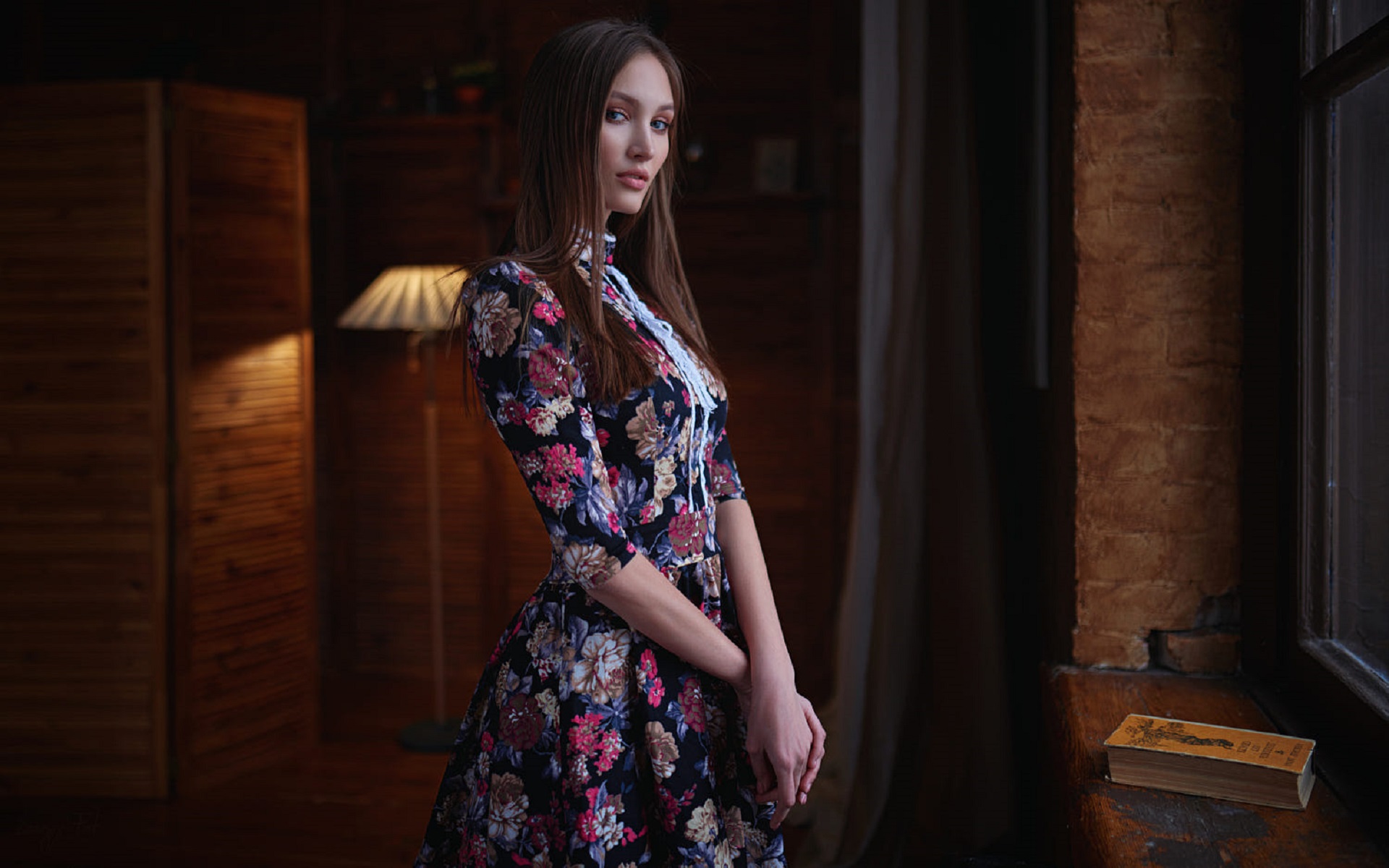 Description: A woman in a floral dress standing in a room with a lamp on the wall and a book on the floor.
