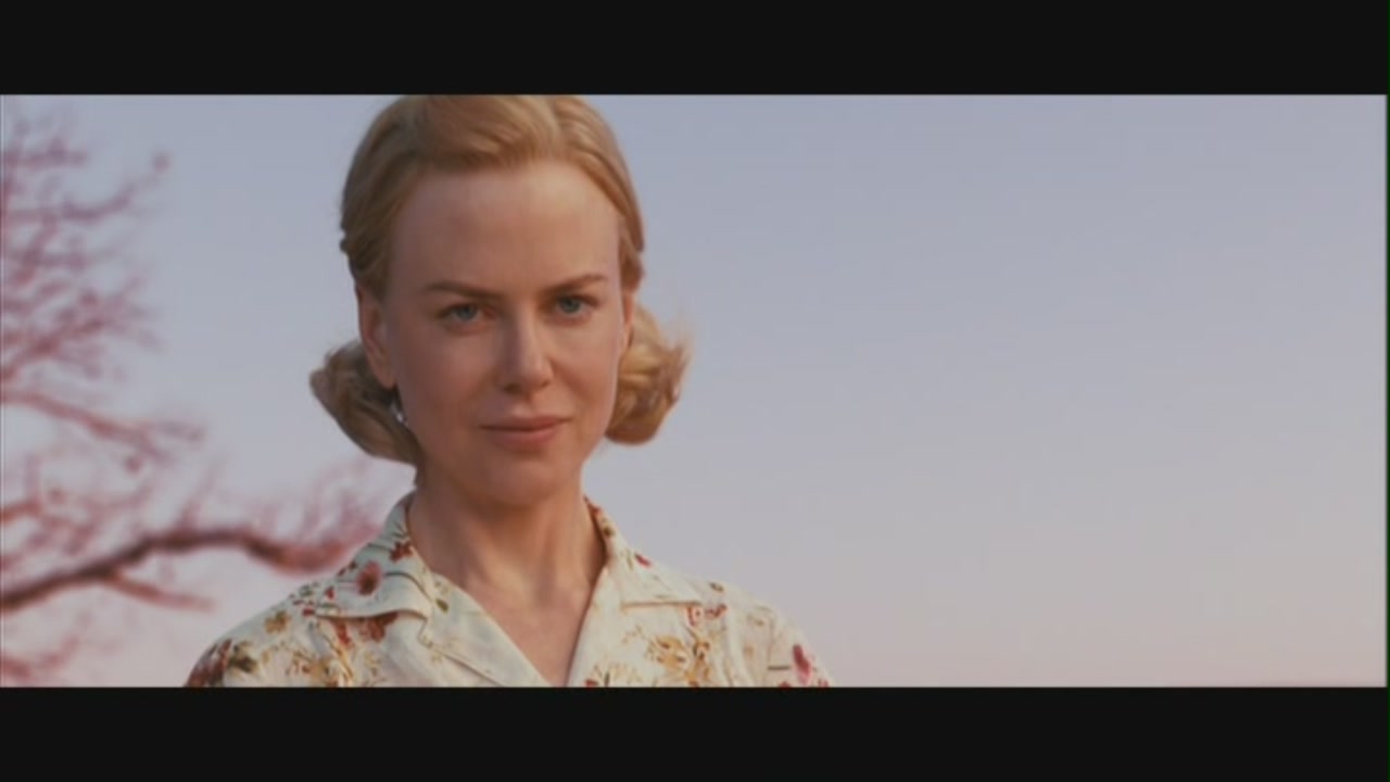 Description: A woman in a floral shirt is standing in front of a tree and a sky background with a pink blossom.