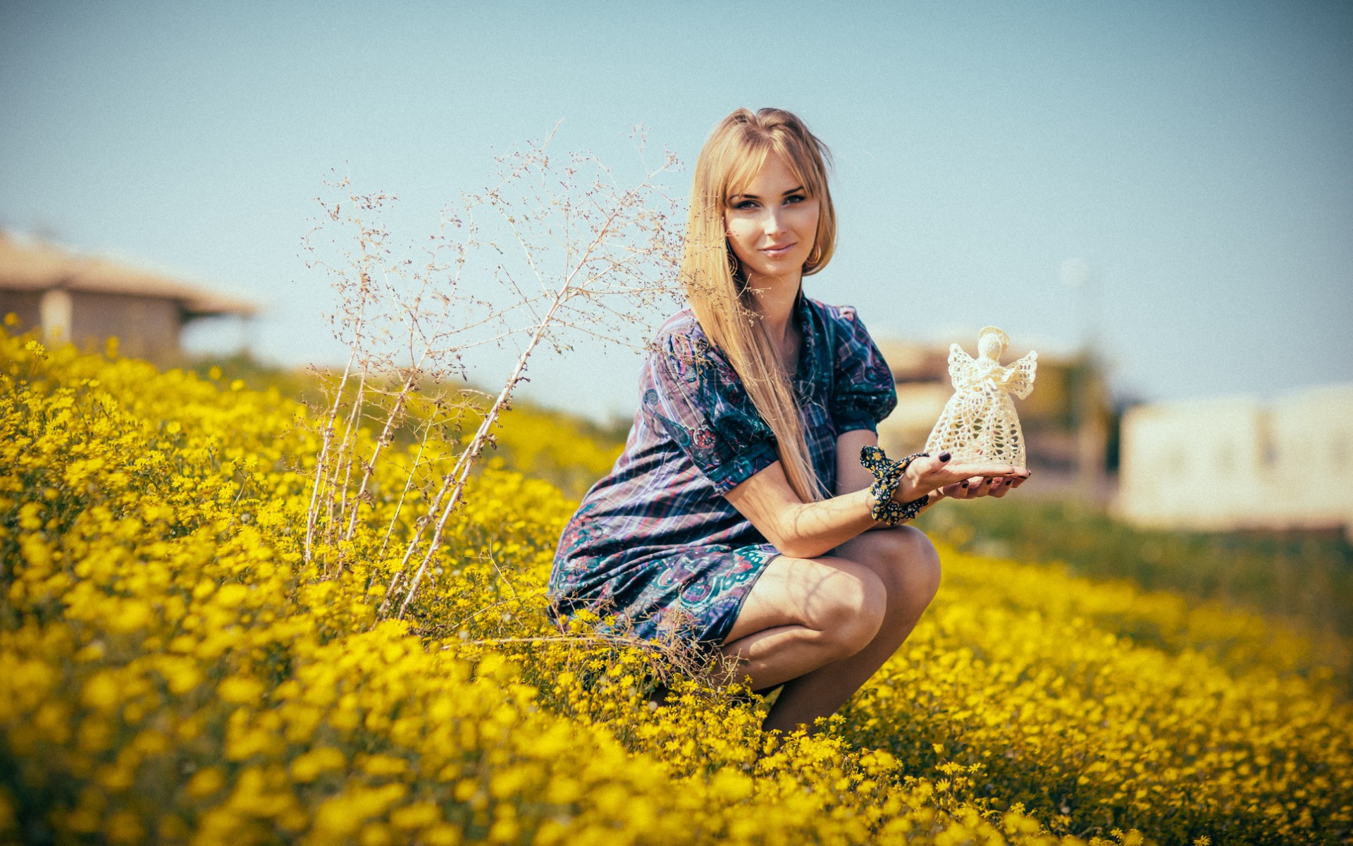 Description: A woman kneeling in a field of yellow flowers holding a small white object in her hand and a small white object in her hand.