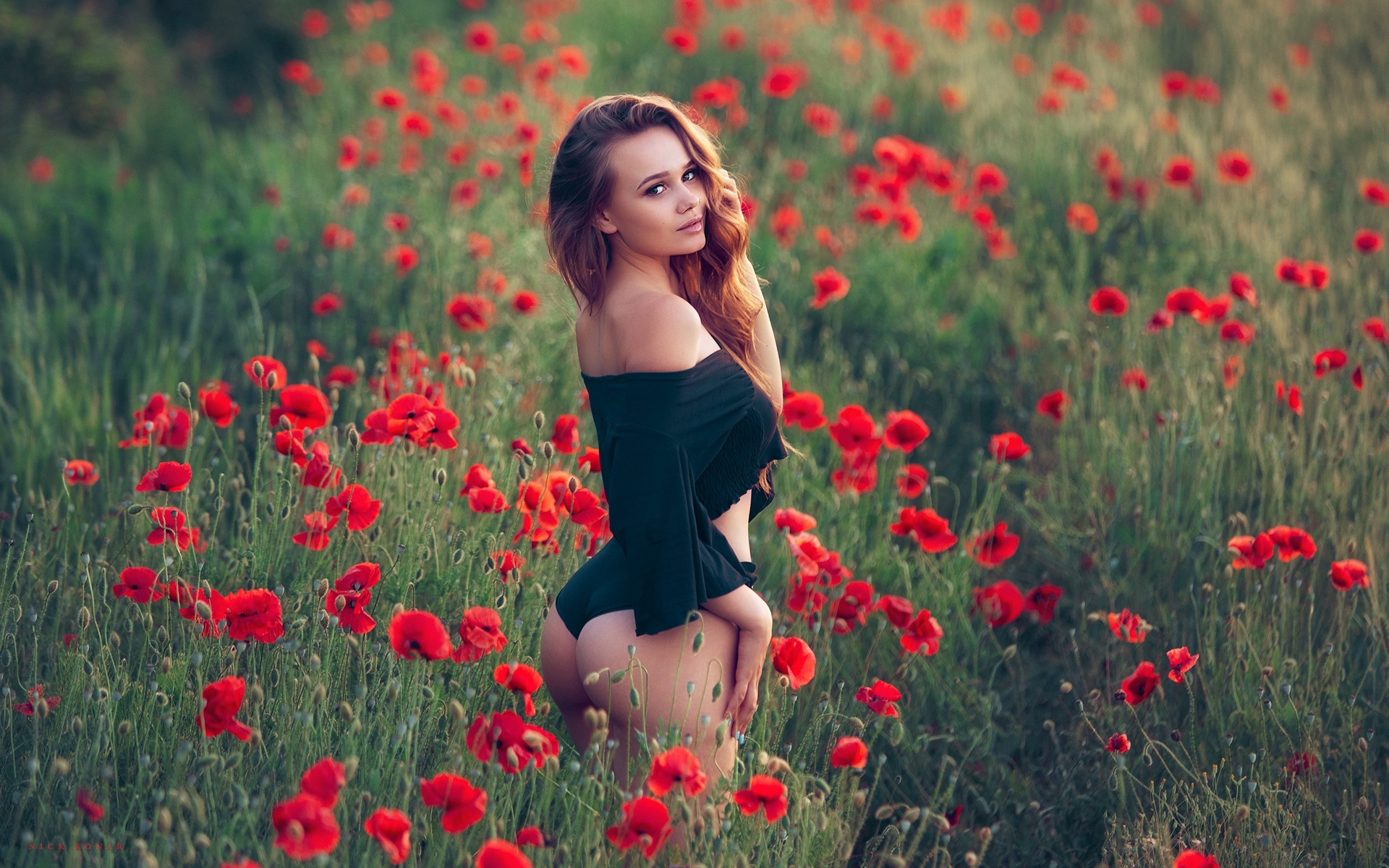 Description: A woman in a field of red flowers posing for a picture with her hands on her hips and her hair in the wind.