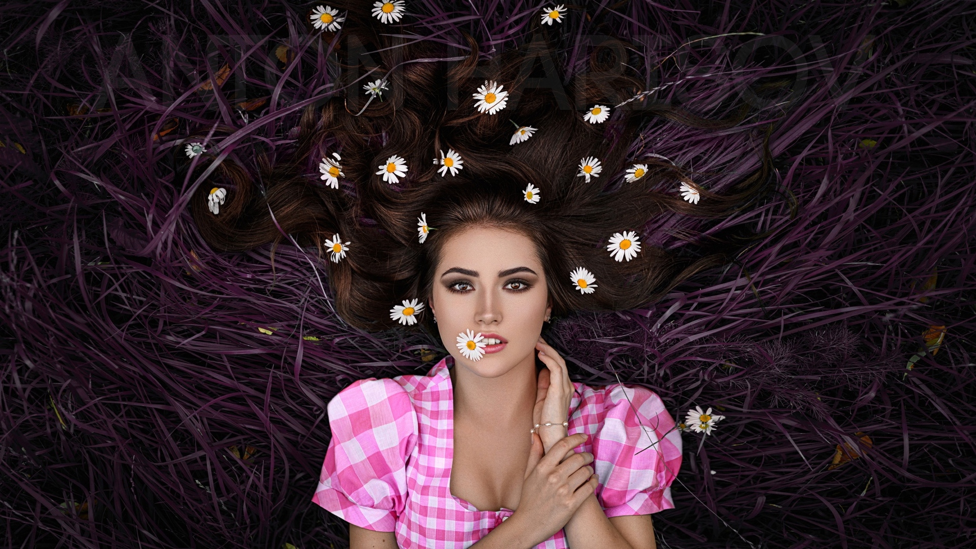 Description: A woman with flowers in her hair laying on the ground with her hands on her face and her eyes closed.