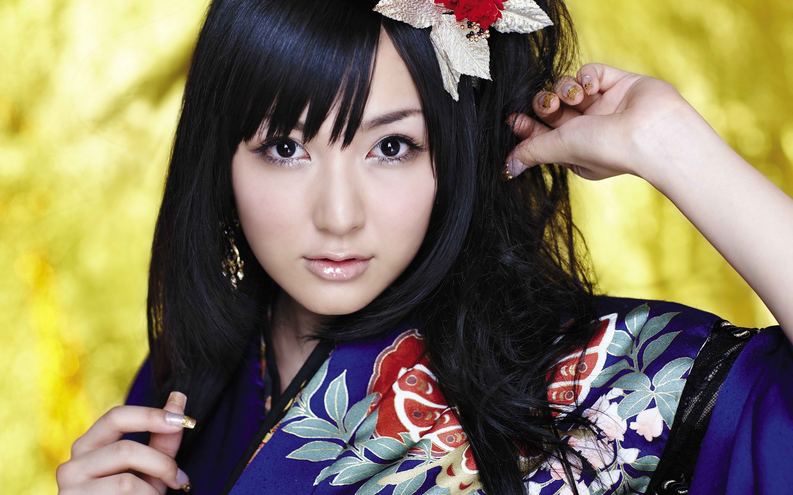Description: A woman with a flower in her hair posing for a picture with a yellow background and a red flower in her hair.