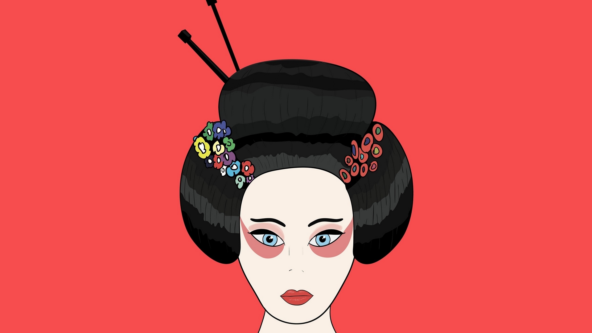 Description: A woman with a hairdow with a flower in her hair and a skull on her head with two sticks sticking out of her hair.