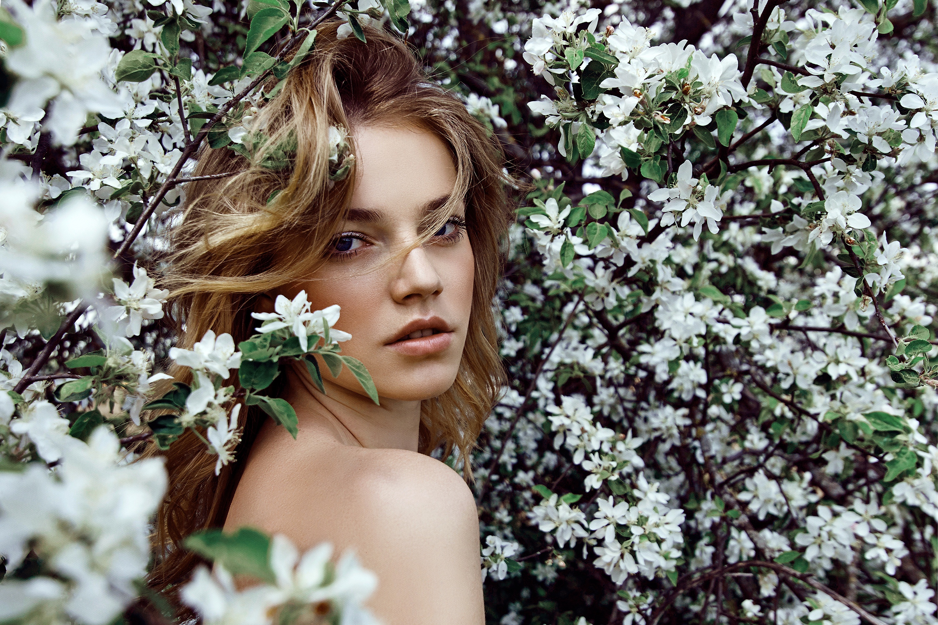 Description: A woman with long hair standing in front of a tree with white flowers on it's branches and looking at the camera.