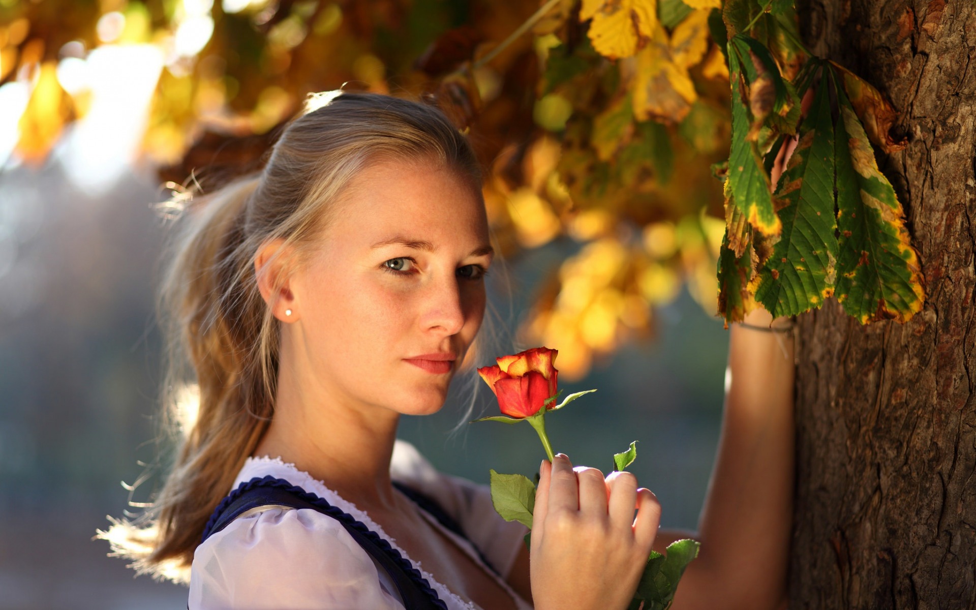 Description: A woman holding a flower in her hand next to a tree with leaves on it and a tree trunk.