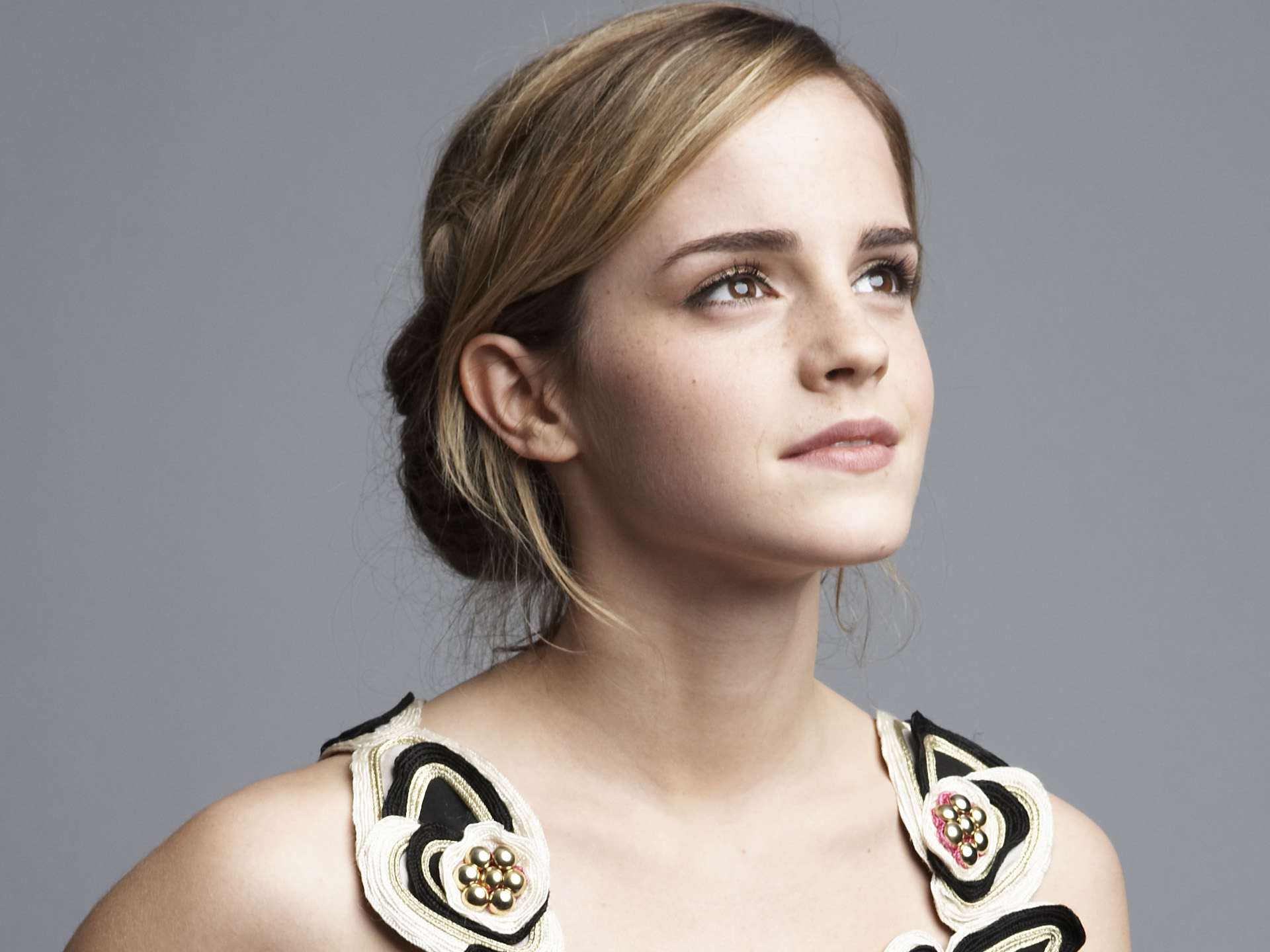 Description: A woman with a flowered dress and a necklace on her neck looking up at something in the air.