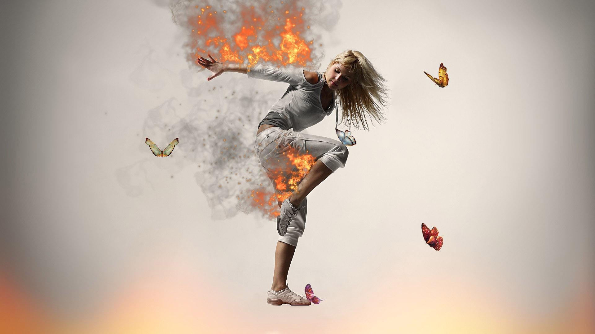Description: A woman is flying through the air with a lot of butterflies around her and a fire in the background.
