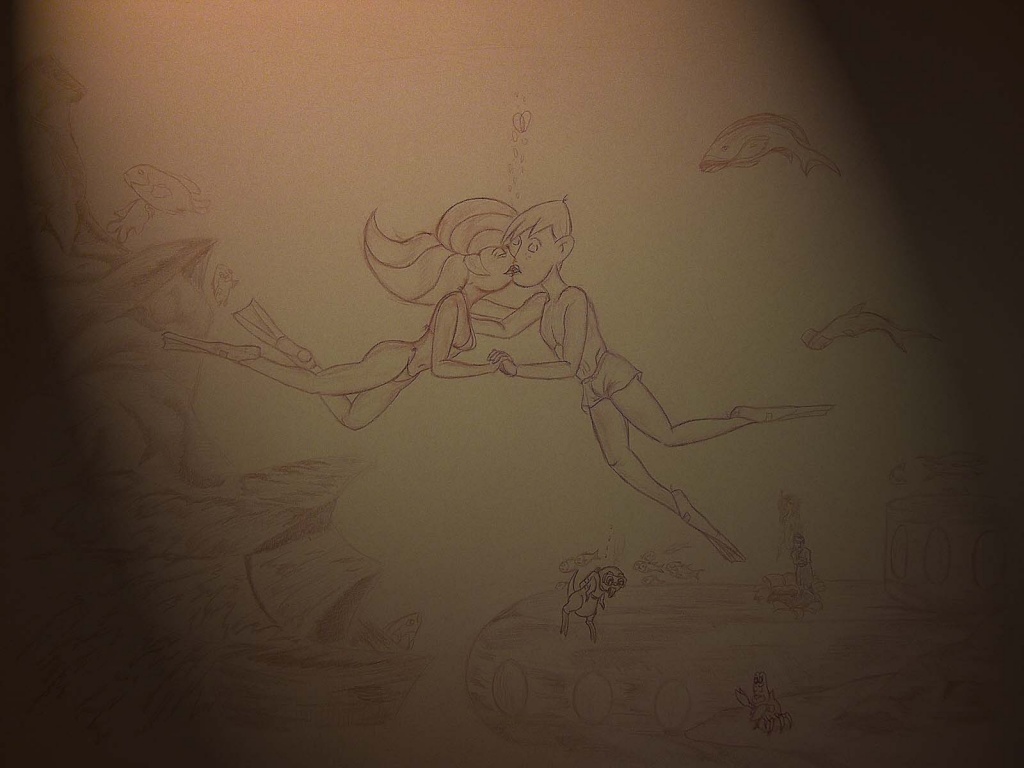 Description: A drawing of a woman flying through the air with a cat on her back and a bird flying above her.