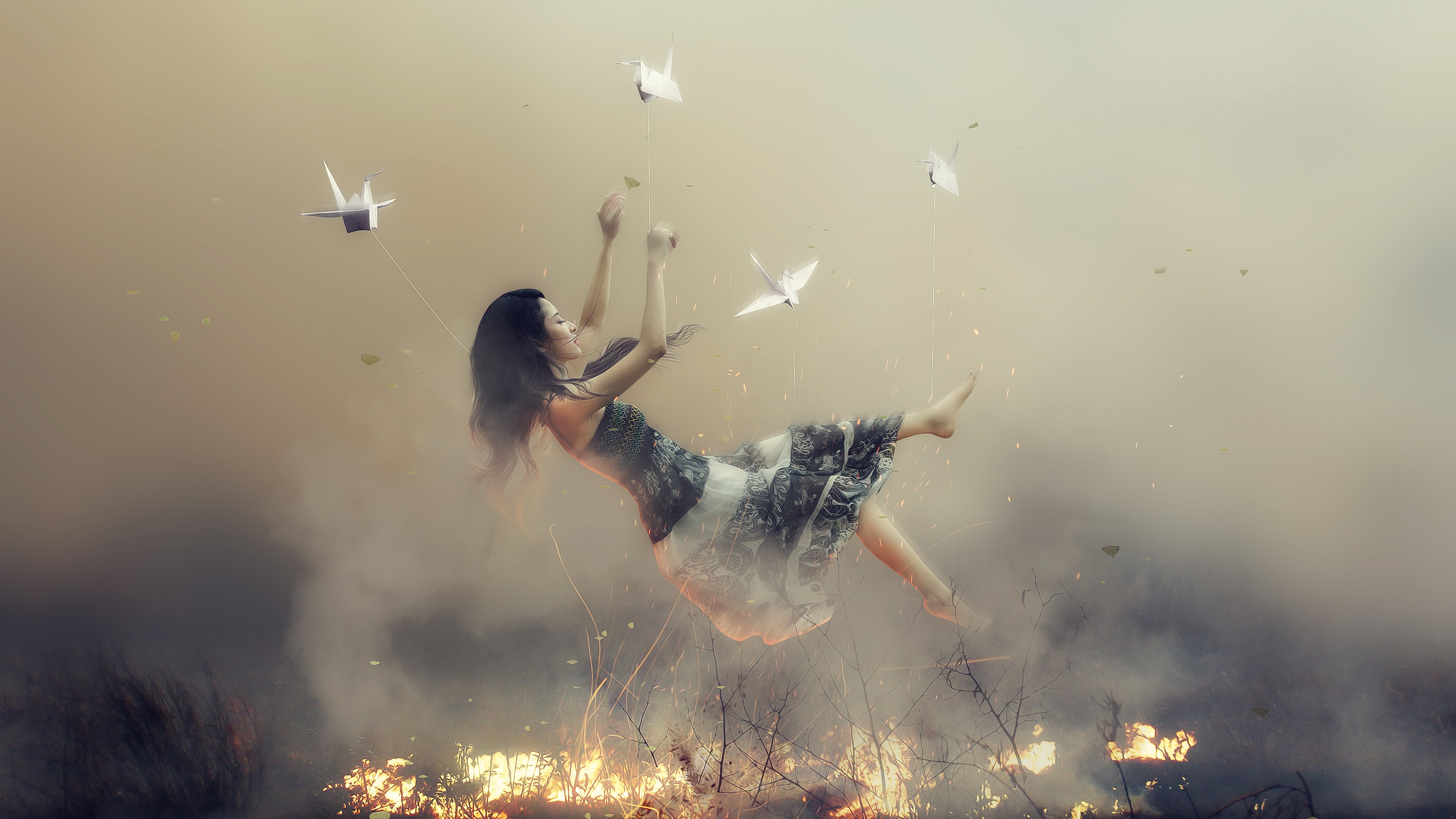 Description: A woman flying through the air while holding onto a kite in her hand and a bunch of birds flying around her.