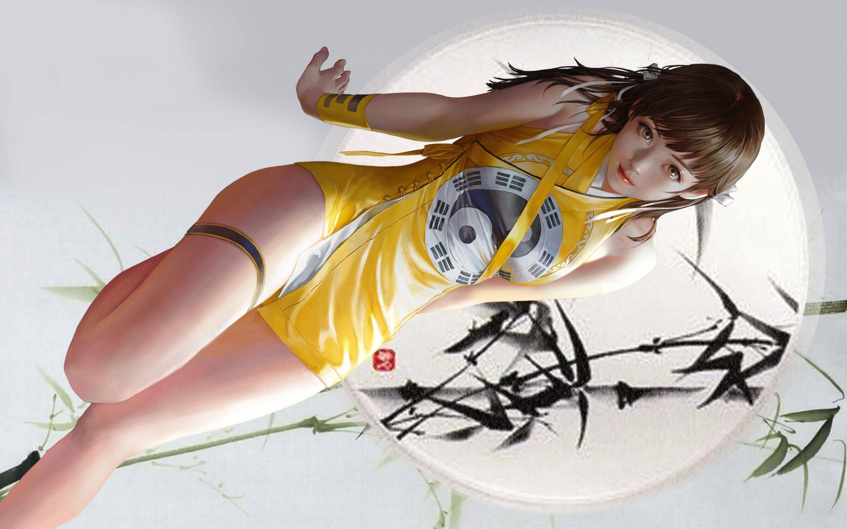 Description: A woman in a yellow shirt is flying through the air with a tennis racket in her hand and a tennis ball in her other hand.