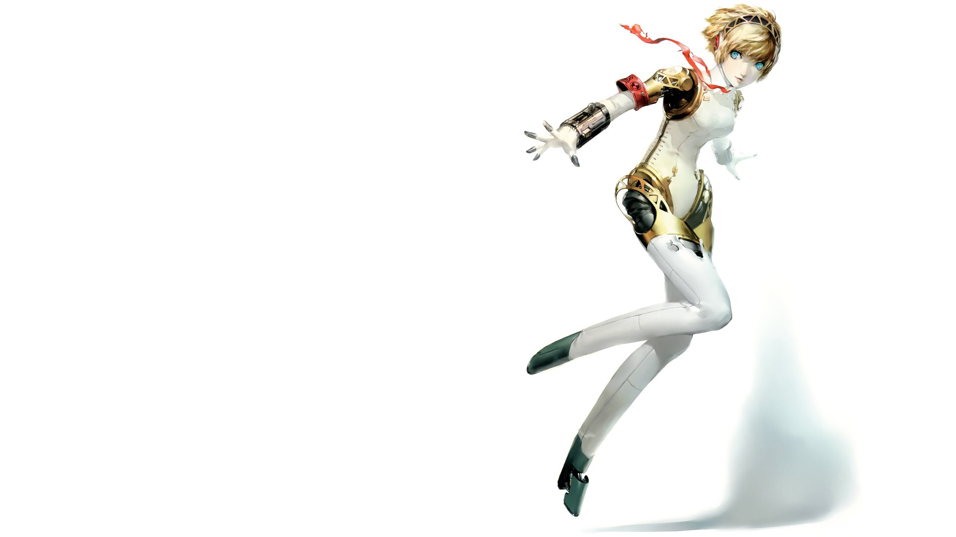 Description: A woman in a white suit is flying through the air with her arms outstretched and legs spread out.