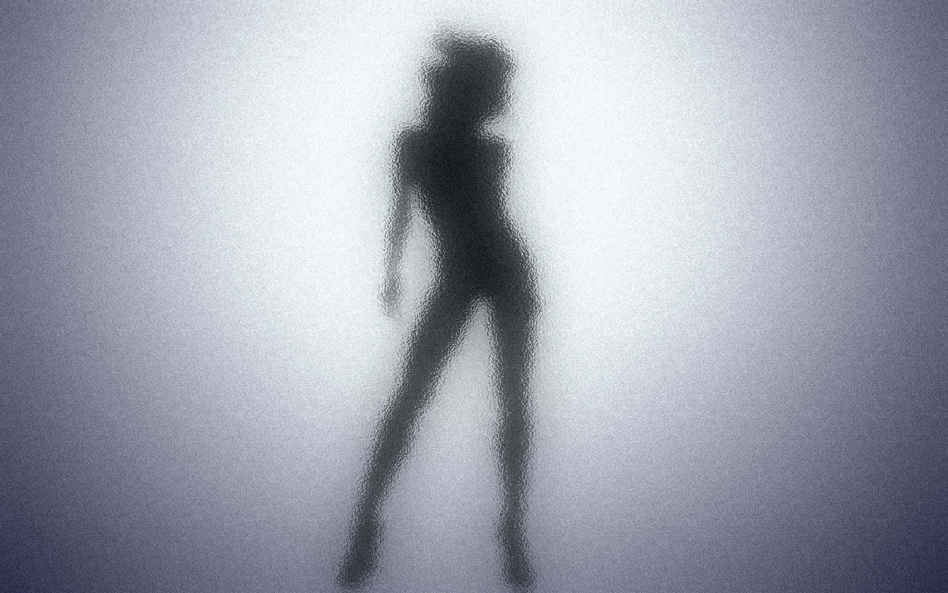 Description: A woman standing in the fog with a skateboard in her hand and a shadow of her head on the wall.