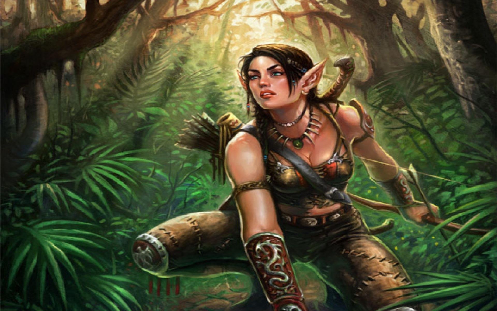 Description: A woman in a forest with a bow and arrow in her hand.