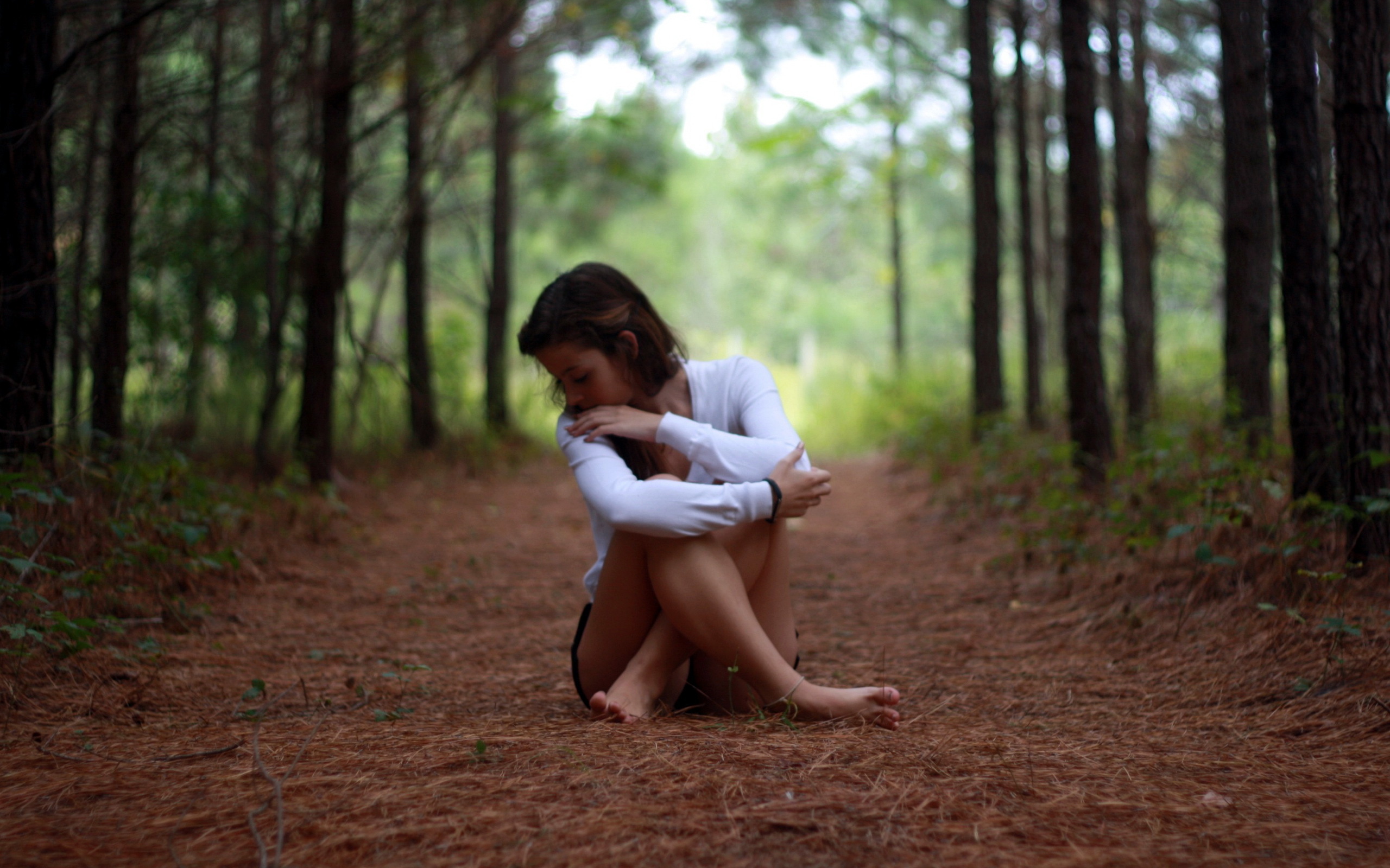 Description: A woman sitting on a dirt road in the woods with her arms wrapped around her knees and her head resting on her hands.