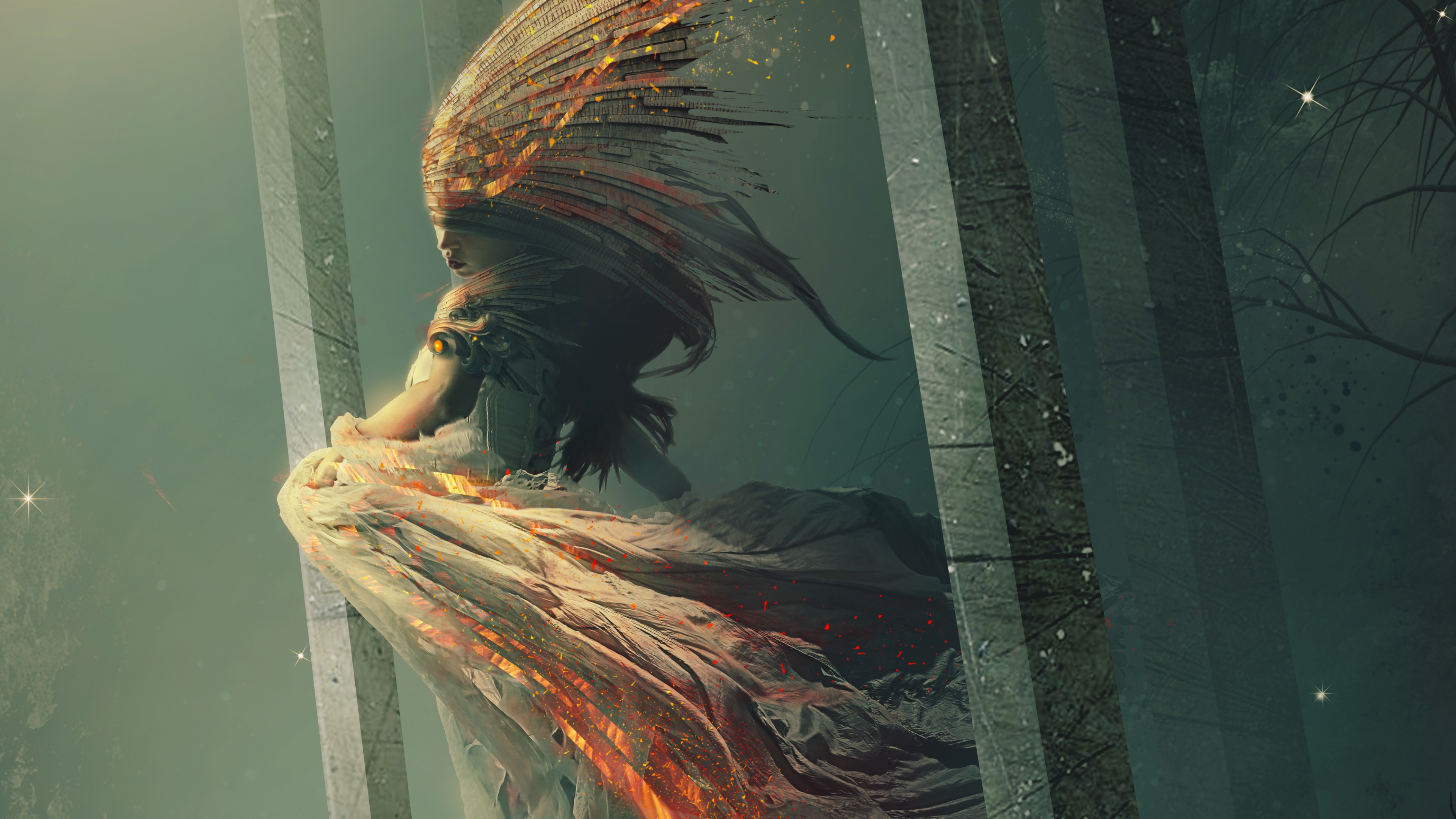 Description: A woman with a long flowing dress in a forest with fire and stars on her head and her hair blowing in the wind.