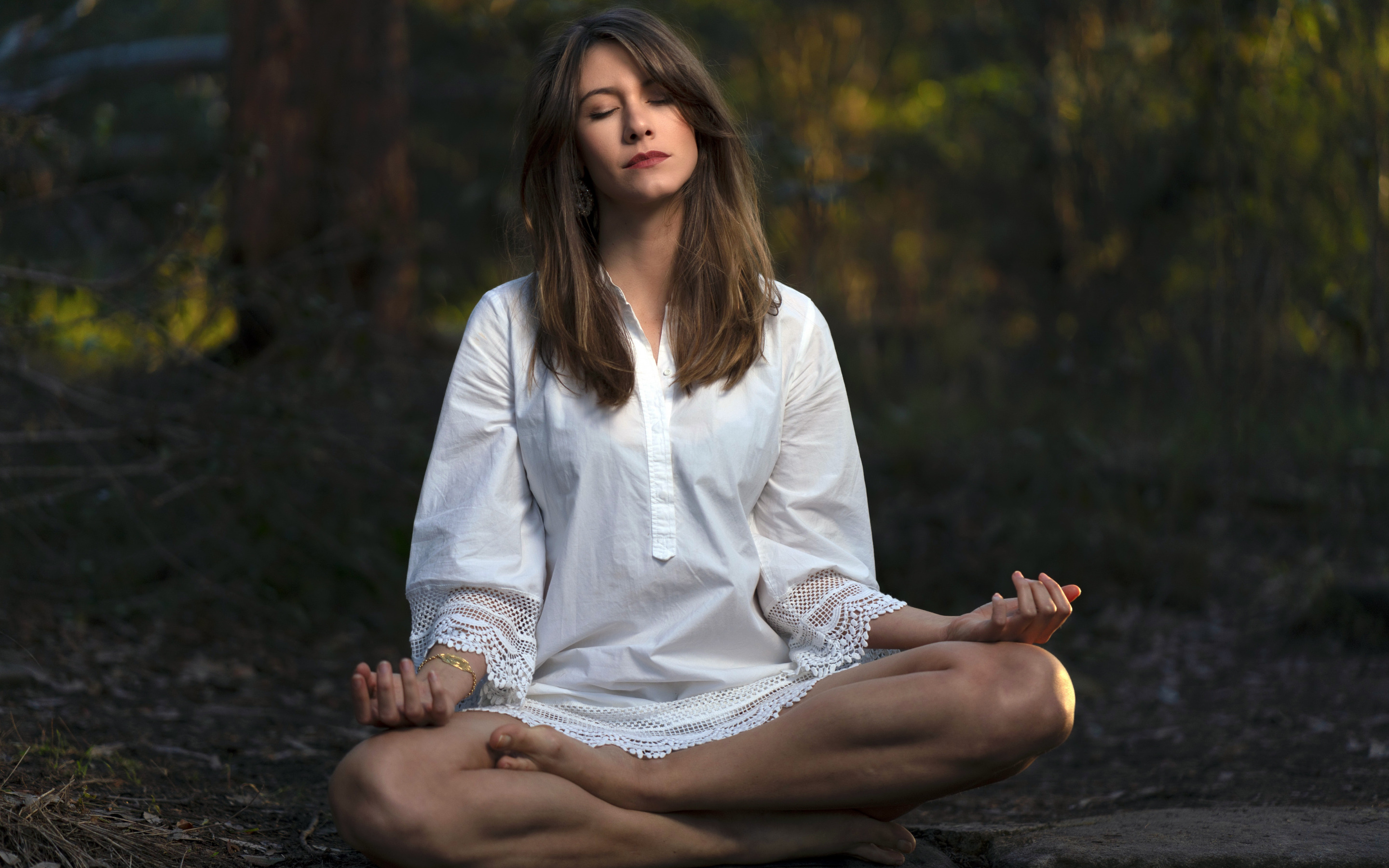 Description: A woman sitting in a lotus position in a forest setting with her eyes closed and eyes closed.