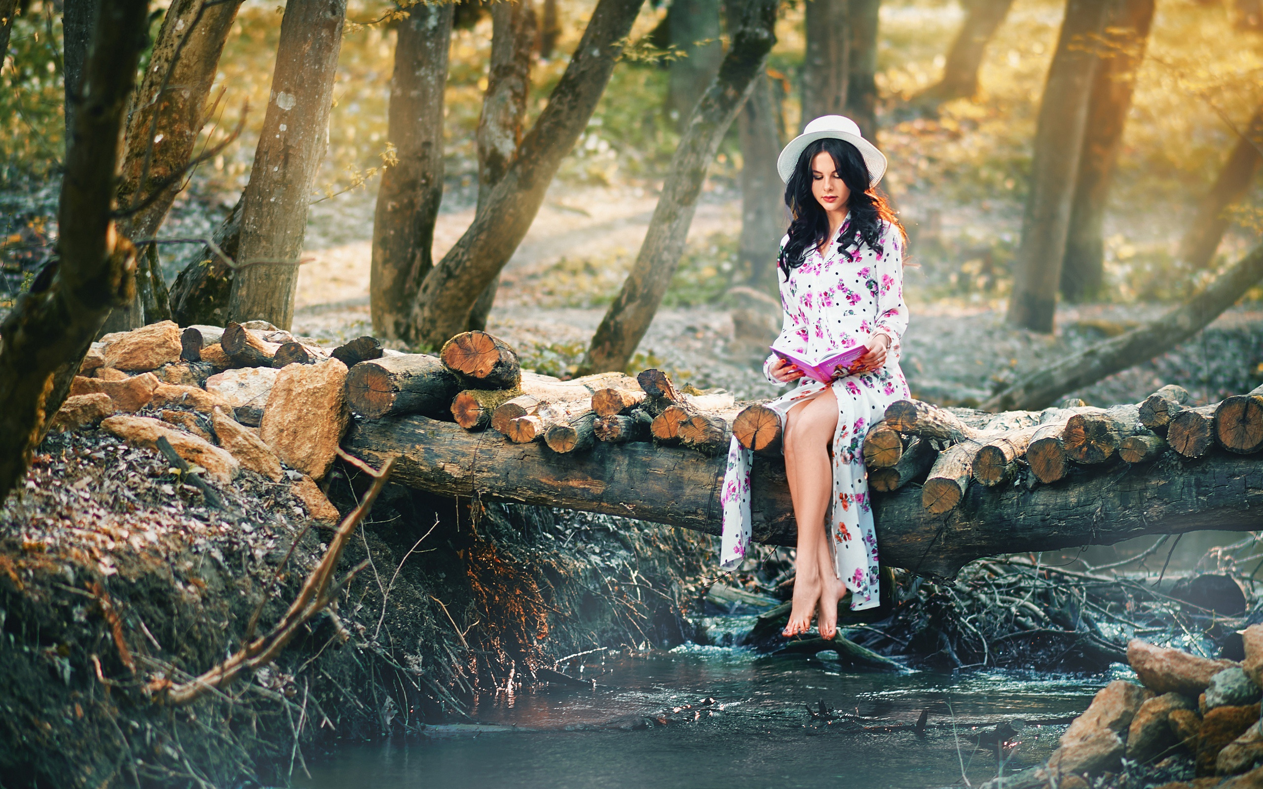 Description: A woman sitting on a log in a forest next to a river and trees with a hat on her head.