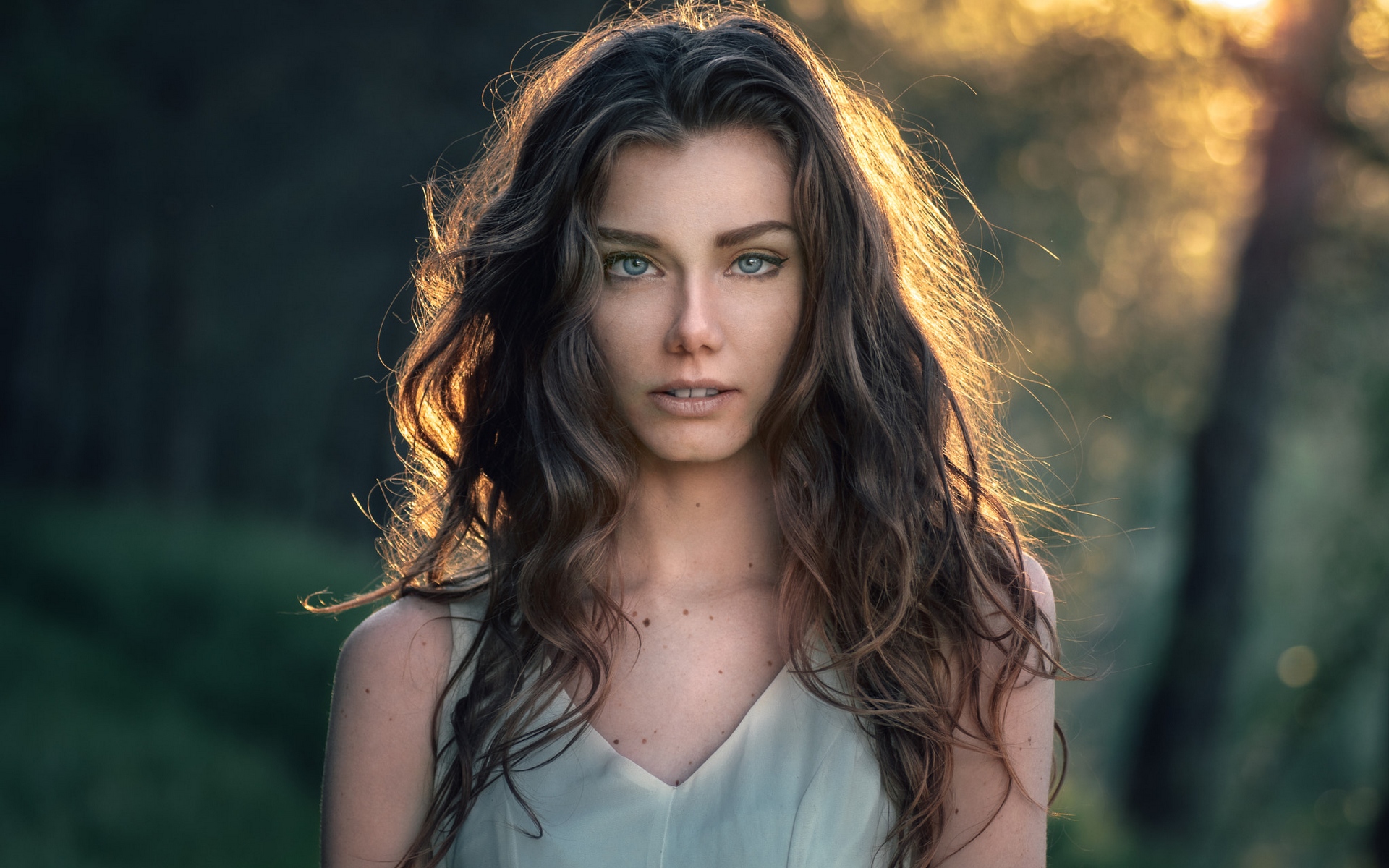 Description: A woman with long hair standing in a forest at sunset with the sun shining through the trees behind her.