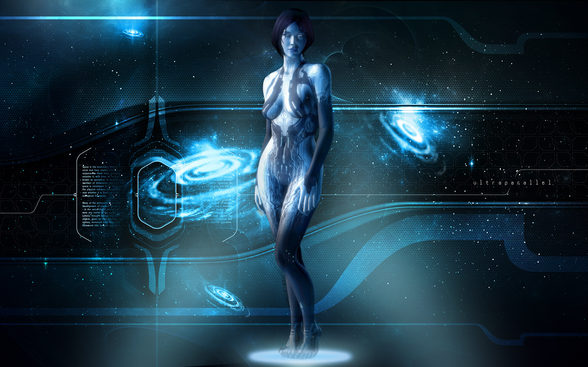 Description: A woman standing in a futuristic space with a blue background and a blue light coming from her body and a blue and white swirl.