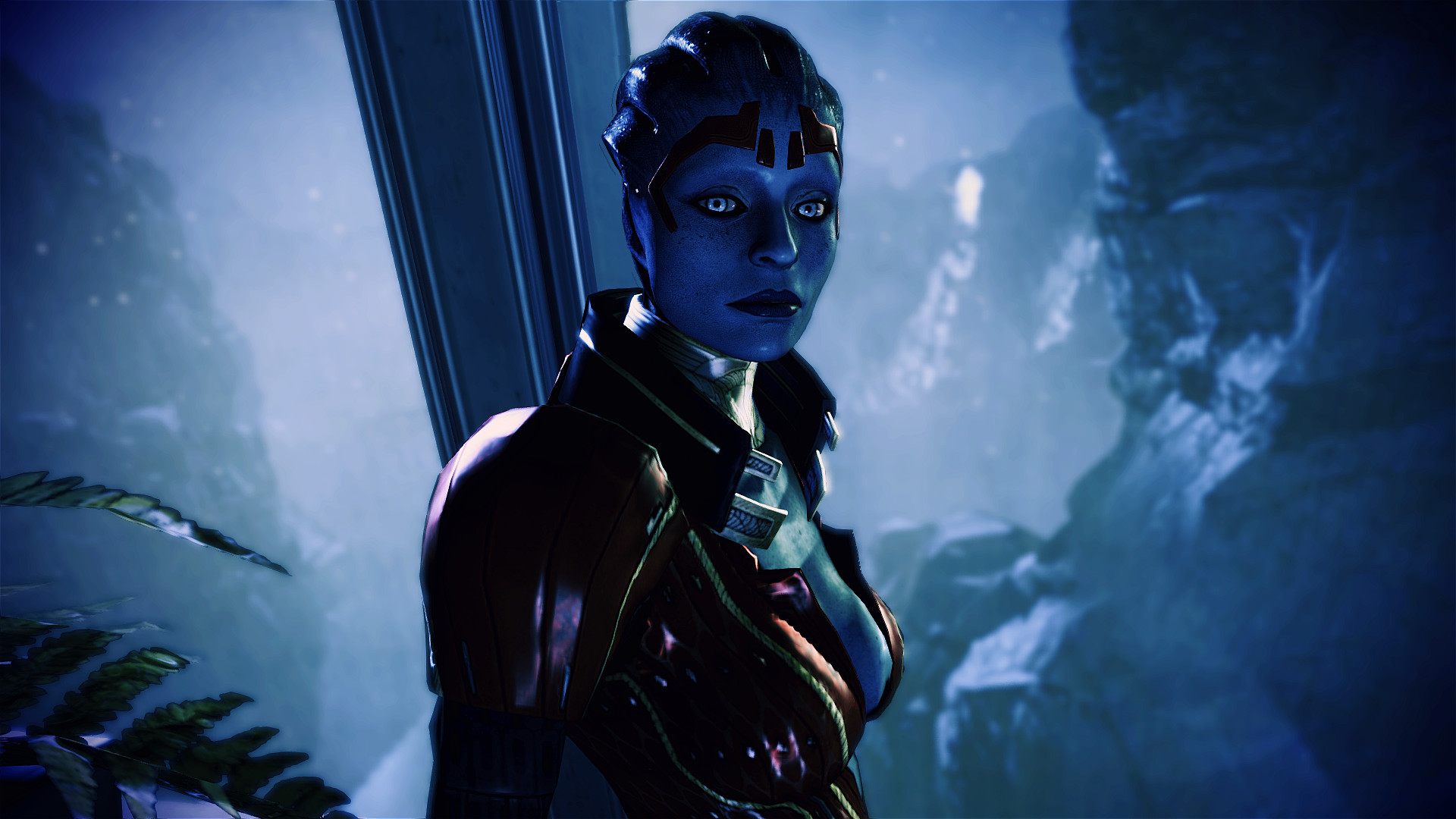 Description: A woman in a futuristic suit standing in front of a window with a plant in her hand and a man in the background.