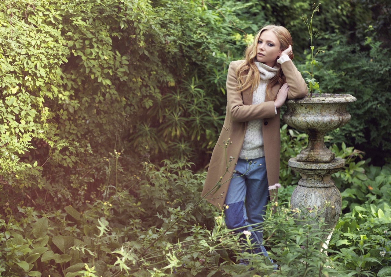 Description: A woman standing in a garden with a coat over her head and a scarf around her neck.