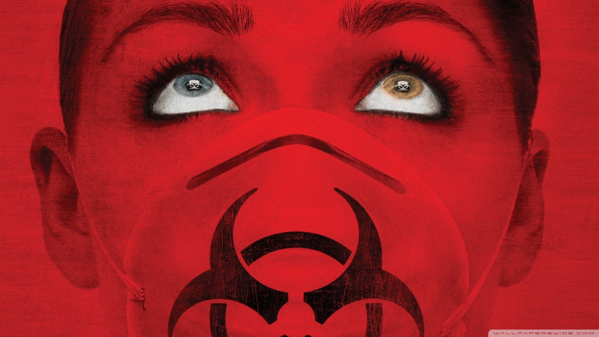 Description: A woman with a gas mask on her face and eyes.