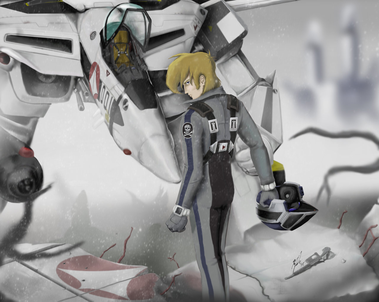 Description: A woman standing next to a giant robot in a snowy area with a sky background and a text that reads.