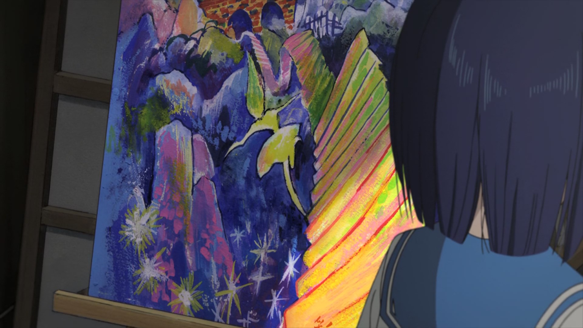 Description: A woman looking at a painting of a giraffe in a room with a ladder and a window.