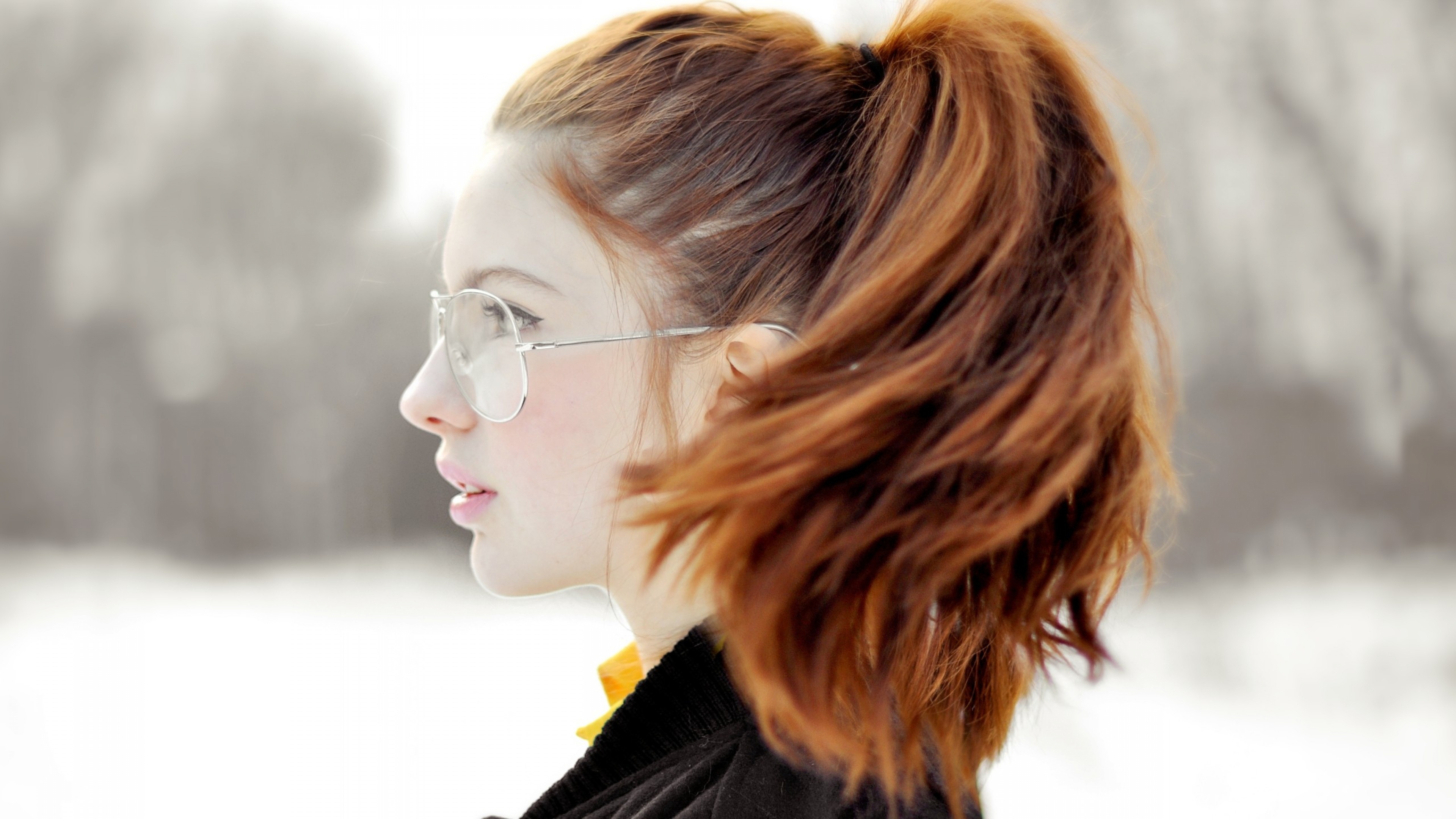 Description: A woman with glasses and a black jacket in the snow with trees in the background and snow on the ground.