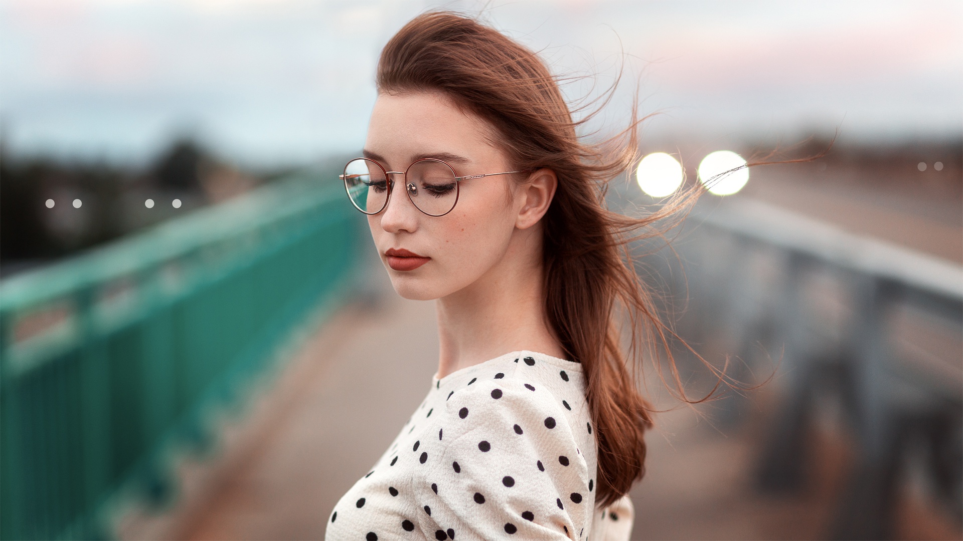 Description: A woman with glasses on looking down at her cell phone while standing on a bridge overpass with lights in the background.