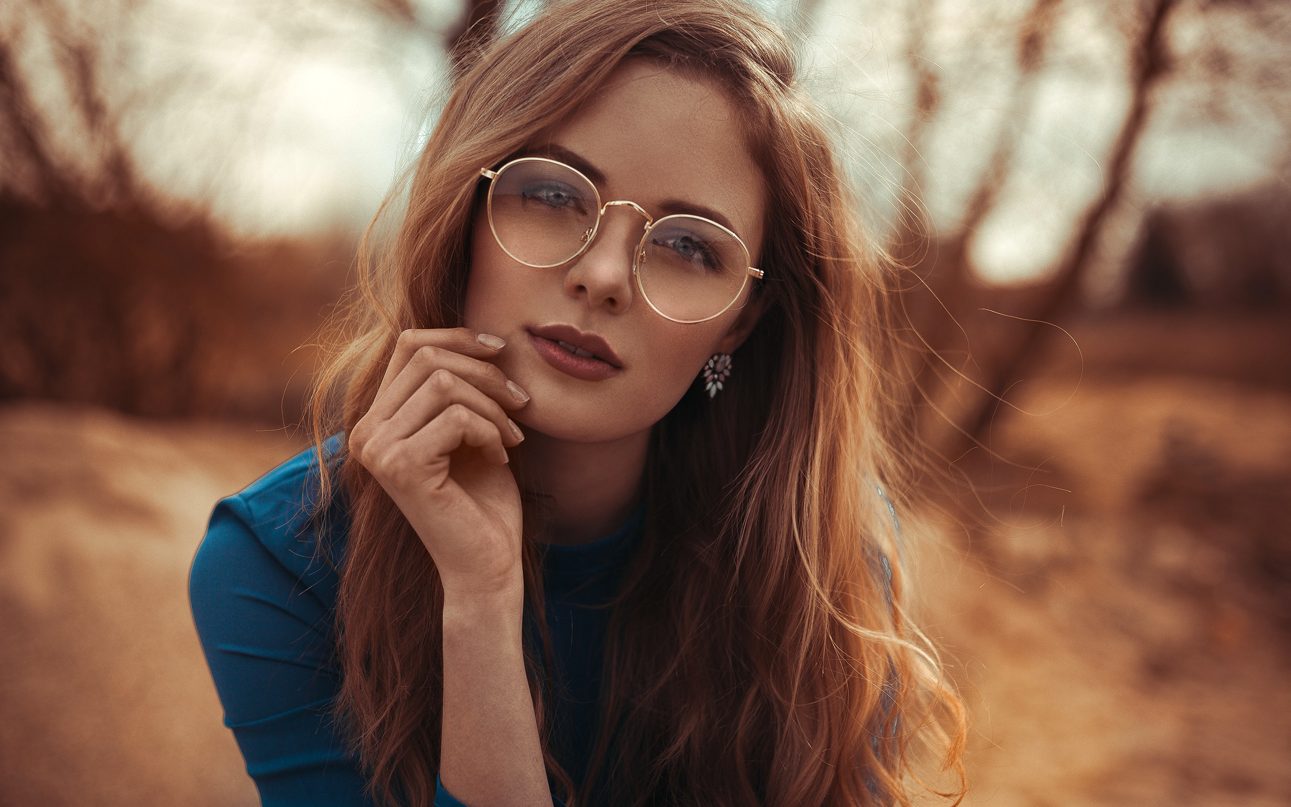Description: A woman wearing glasses is posing for a picture in a field with trees in the background and a dirt road.