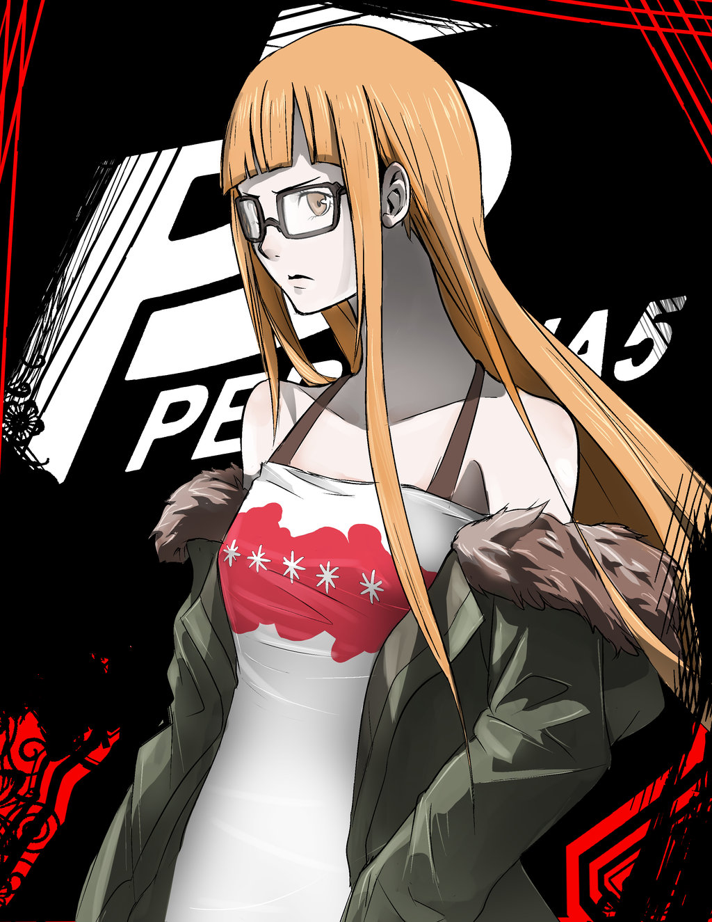 Description: A woman with glasses and a red shirt is standing in front of a black background with a red and white design.