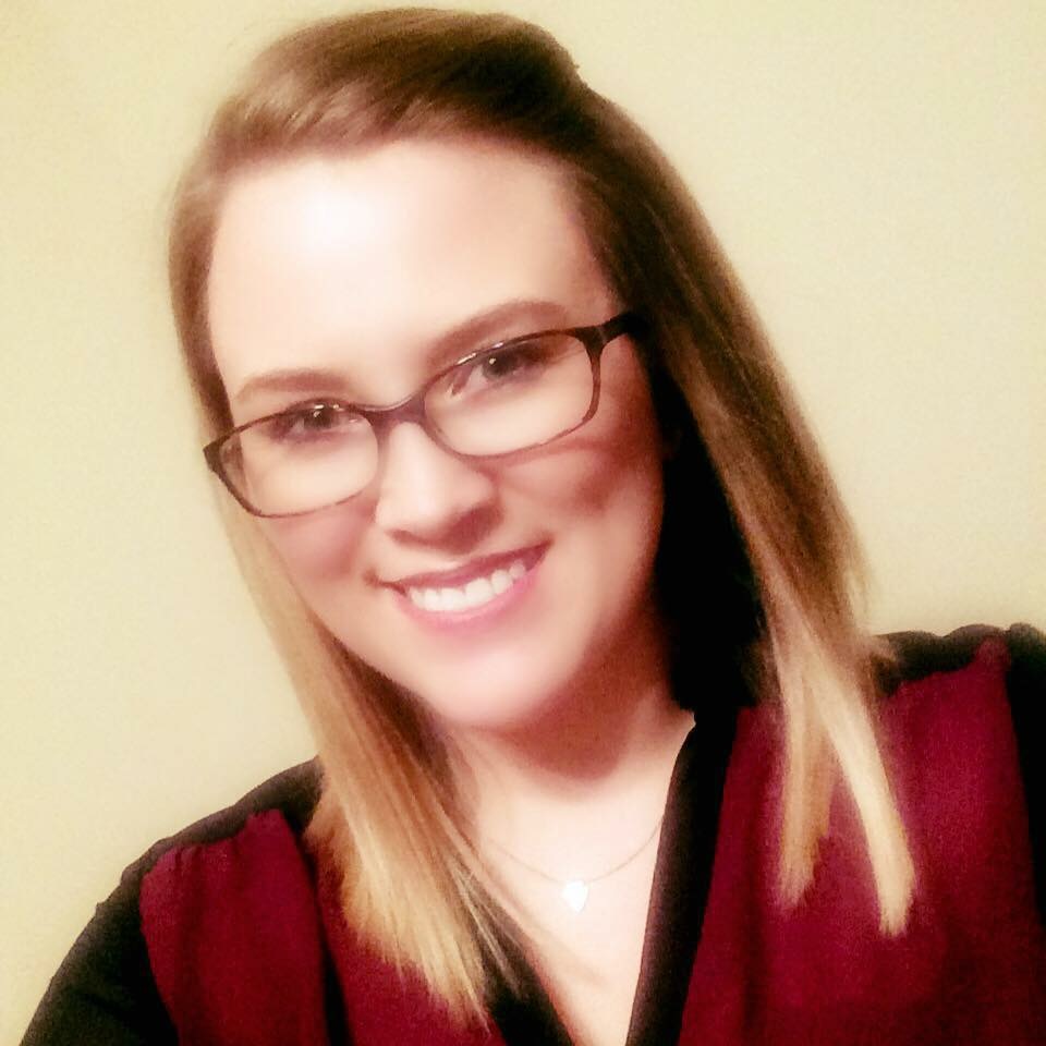 Description: A woman with glasses is smiling for the camera with a smile on her face and a red shirt on.