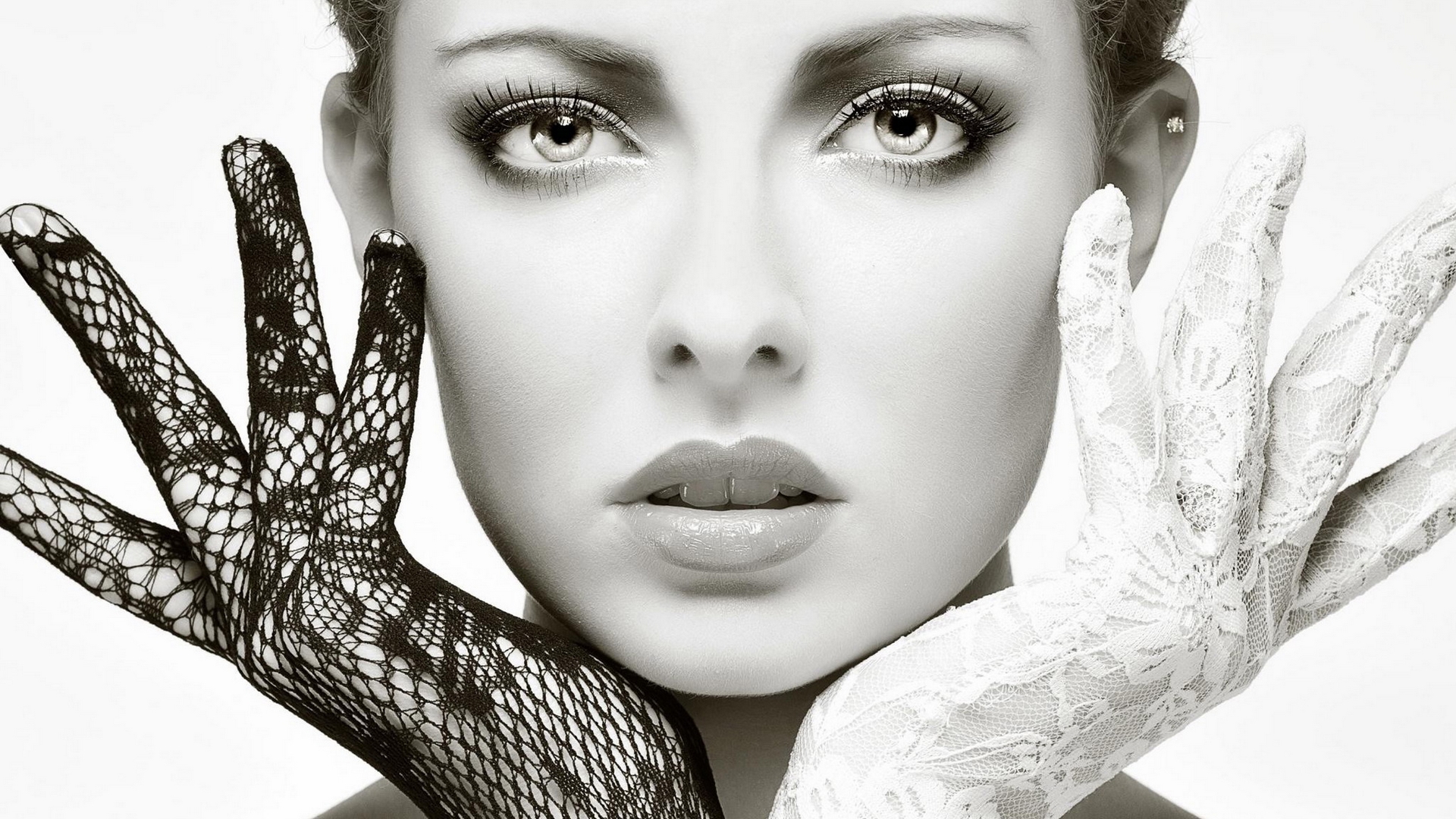 Description: A woman with a glove on her hand and a white dress on her shoulder and a white lace glove on her hand.