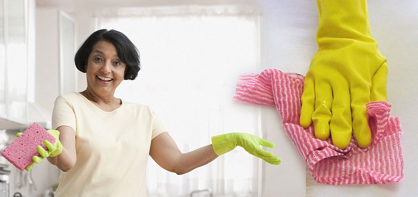 Description: A woman holding a sponge and a pair of gloves on her left hand and a pink glove on the right hand.