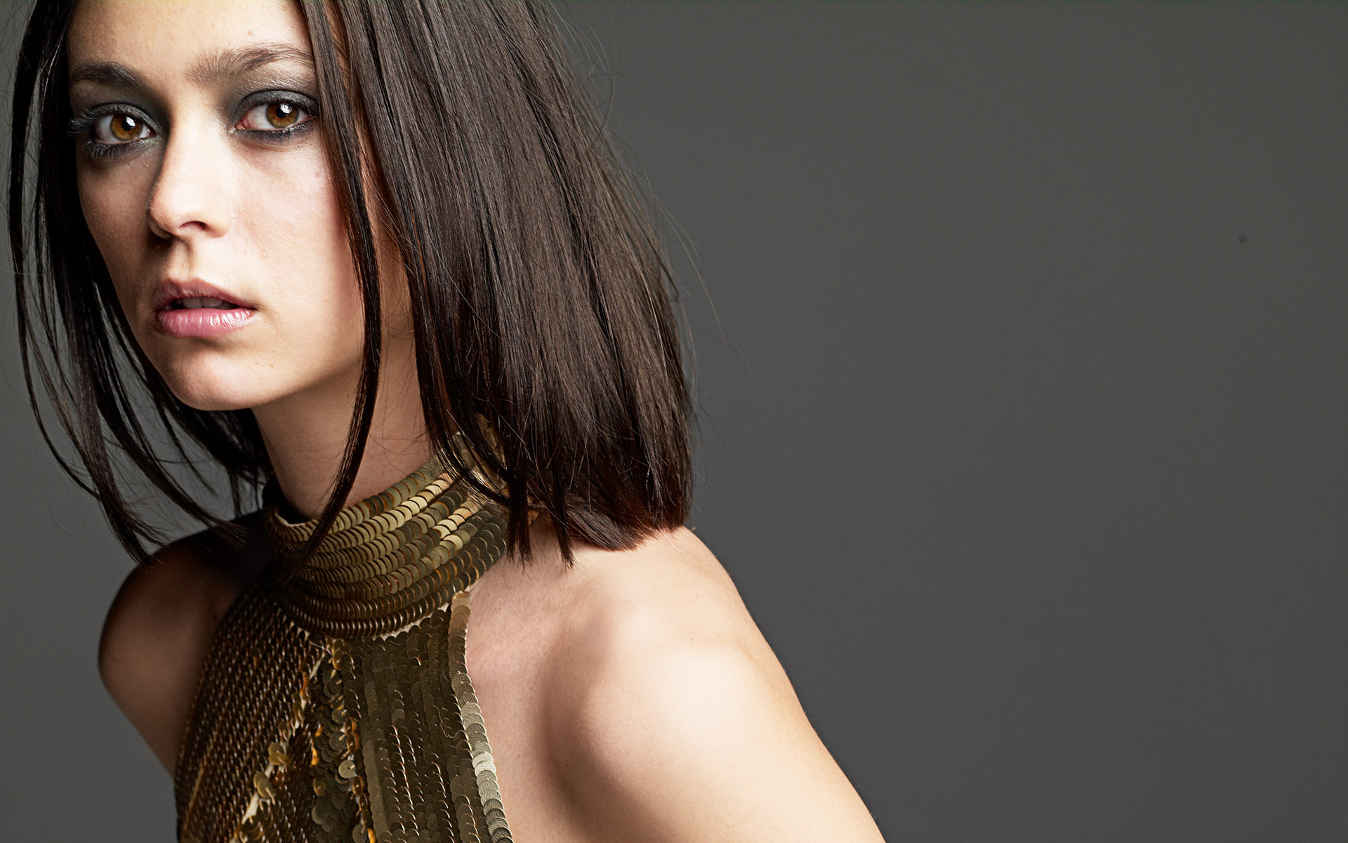 Description: A woman with a gold dress and a black choker on her neck and a black background with a green border.