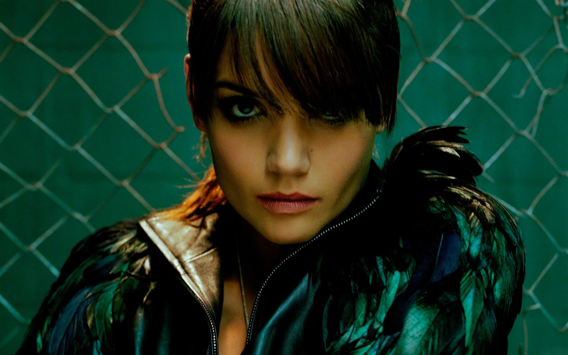 Description: A woman with a black jacket and a green background with a chain link fence behind her and a green wall behind her.