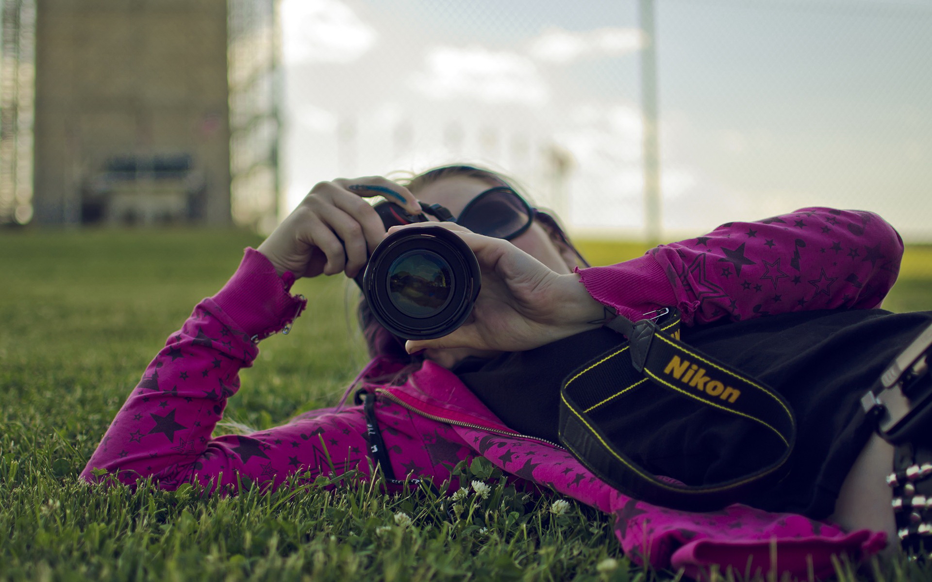 Description: A woman laying on the grass taking a picture with a camera lens in her hand and a building in the background.