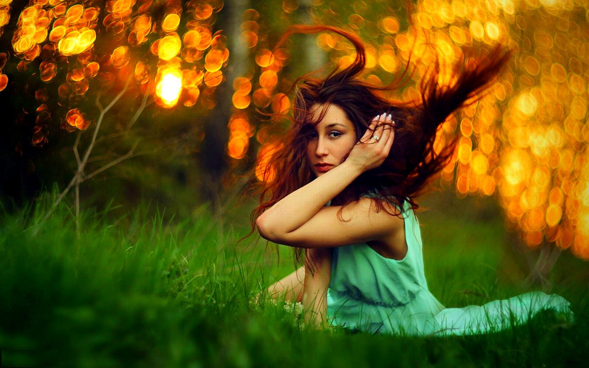 Description: A woman sitting in the grass with her hair blowing in the wind and a boke of lights behind her.